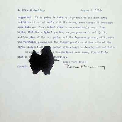 Typewritten 2 page letter on Warren H. Manning letterhead, from Warren Manning to Mrs. F.A. Seiberling regarding the "little Formal and Japanese Gardens" stating that he will make some sketches and send them for her to consider. He mentions a conversation with "your son" regarding omitting terraces in the front of the house which he agrees with. He also writes of a garden walk "leading straight away from the terrace on the opposite side of the garden in the quarry" stating that it will take up too much of the lawn area. The letter is signed in black ink. There is a large black ink spot over the right side of the 2nd paragraph.Subject