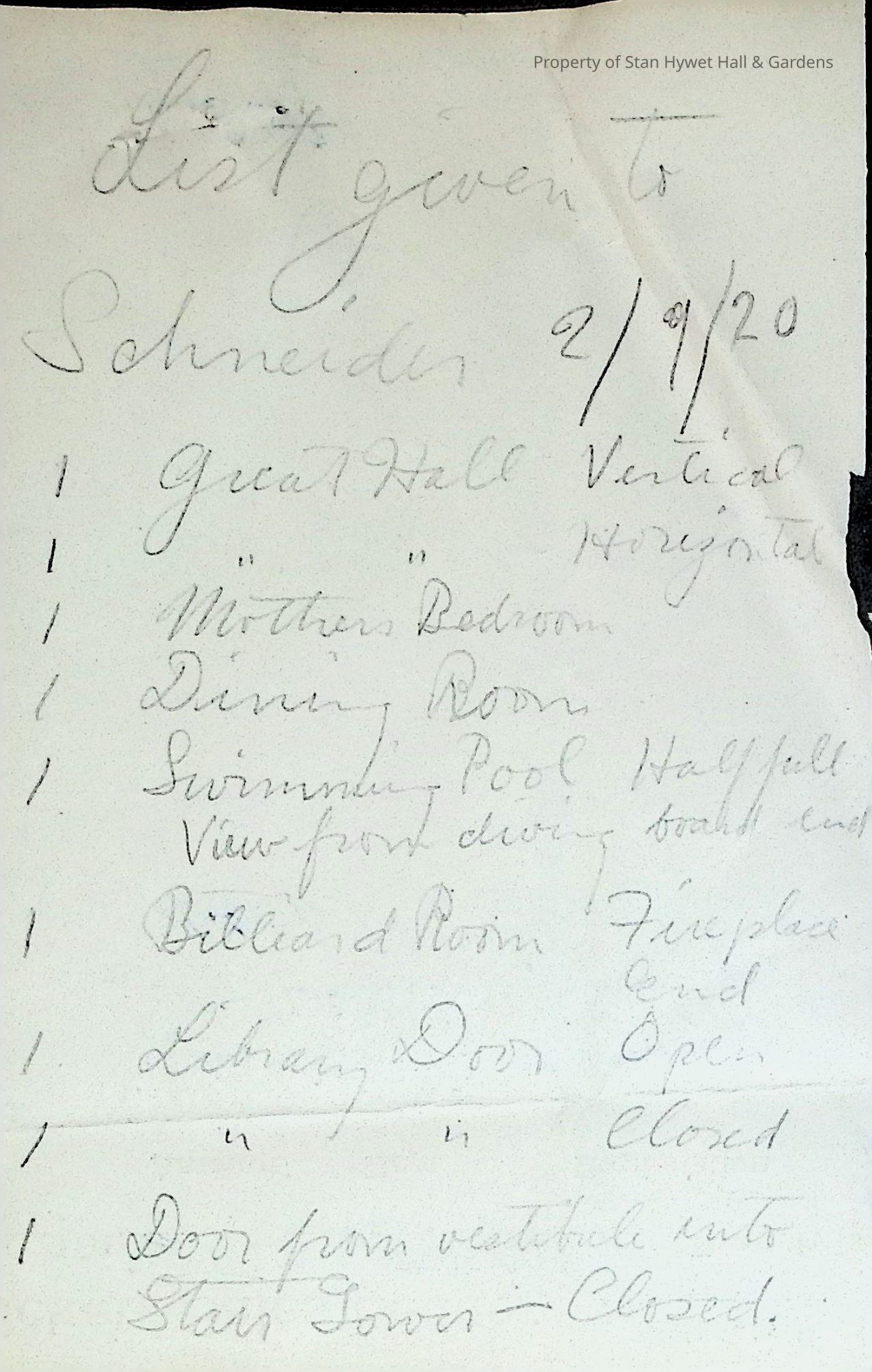 Handwritten list of rooms in the Manor House stating "List given to Schneider 2/9/20". Likely a list of photographs of interior spaces requested in multiple letters from Charles Schneider. Written on plain paper and not signed.Subject