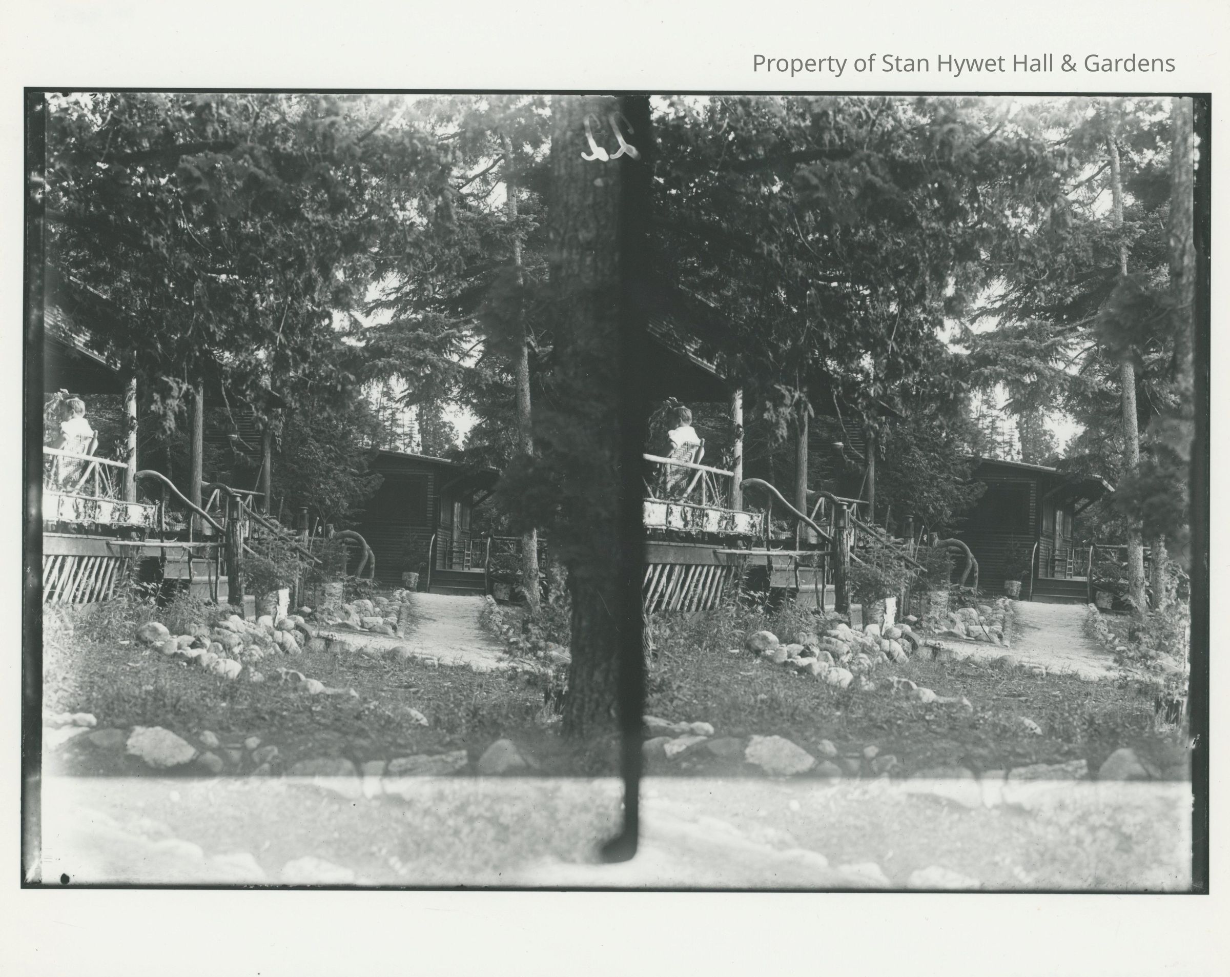 Black and white stereograph of a side view portion of the Main Cabin at SunSands, porch in center left with a dirt path leading to another cabin in center middle ground. Rocks border grass, dirt pathway and tree in foreground. Unidentified man with rolled up sleeve sits in a chair with his back to the wooden railing of porch. Wooden hand rails by porch steps in left middle ground. Cabin in center middle ground has three steps leading upward to partially covered porch. Trees throughout background. Series of Camp SunSands prints.Photograph Details