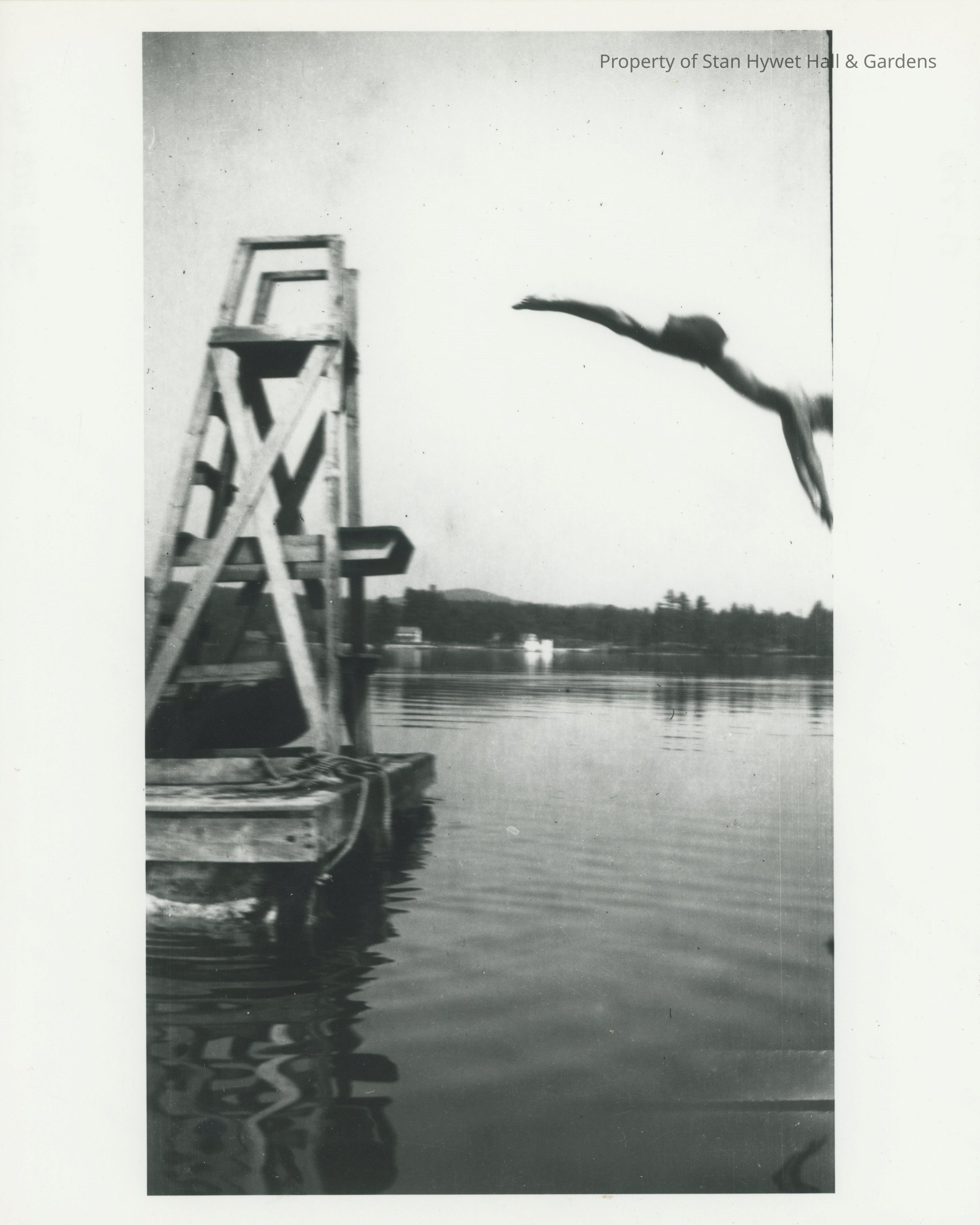 Black and white photograph reprint of young man diving from the platform on the dock at SunSands. He appears to be wearing only swim trunks as a opposed to the full body swimsuit worn by men in the other photos in the series.Photograph Details