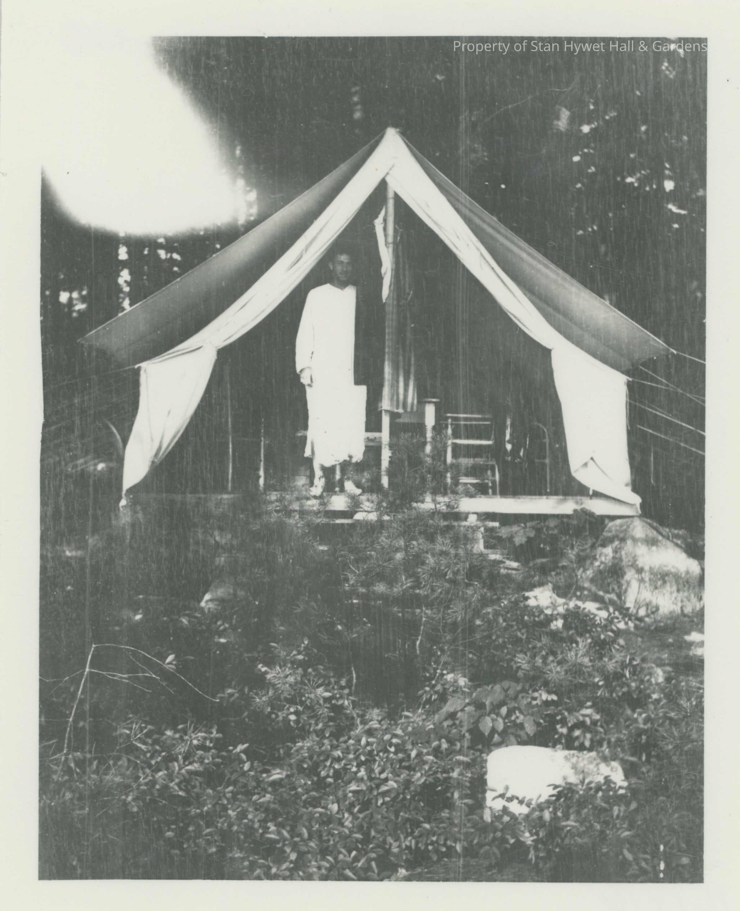 Black and white photographic print of a man standing inside the open flaps of a tent in a night shirt. The tent is on a wooden platform and a table and chair are visible inside. Large trees in back of tent, small pines in front. Rocks scattered in foreground. Large light seepage area upper left corner.Photograph Details