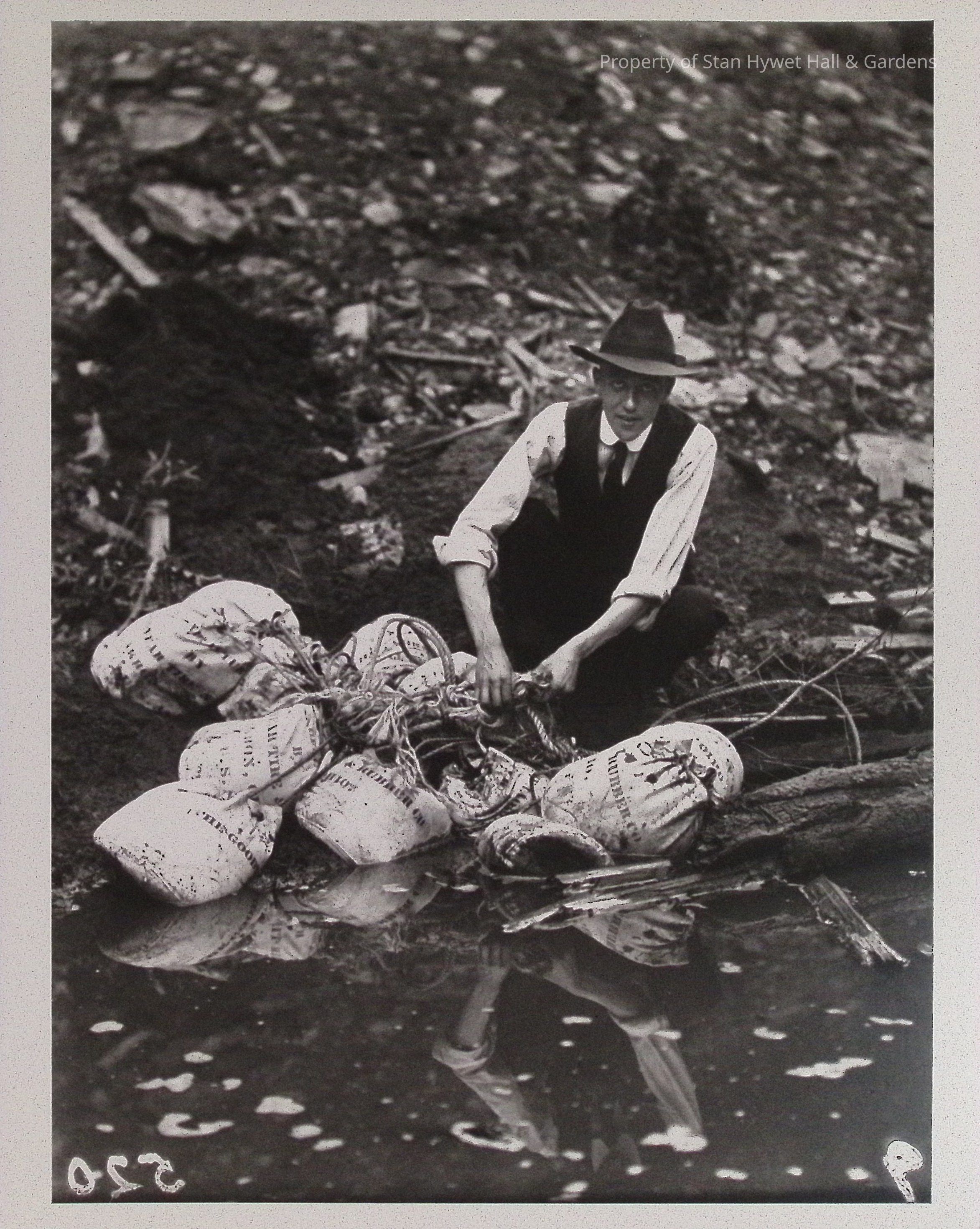 Print developed from gelatin dry plate glass negative. Unidentified man unties ropes to parachute sandbags near water. Water with part of tree floating in foreground. Hill with natural debris in background. Series of parachute drops.Collection