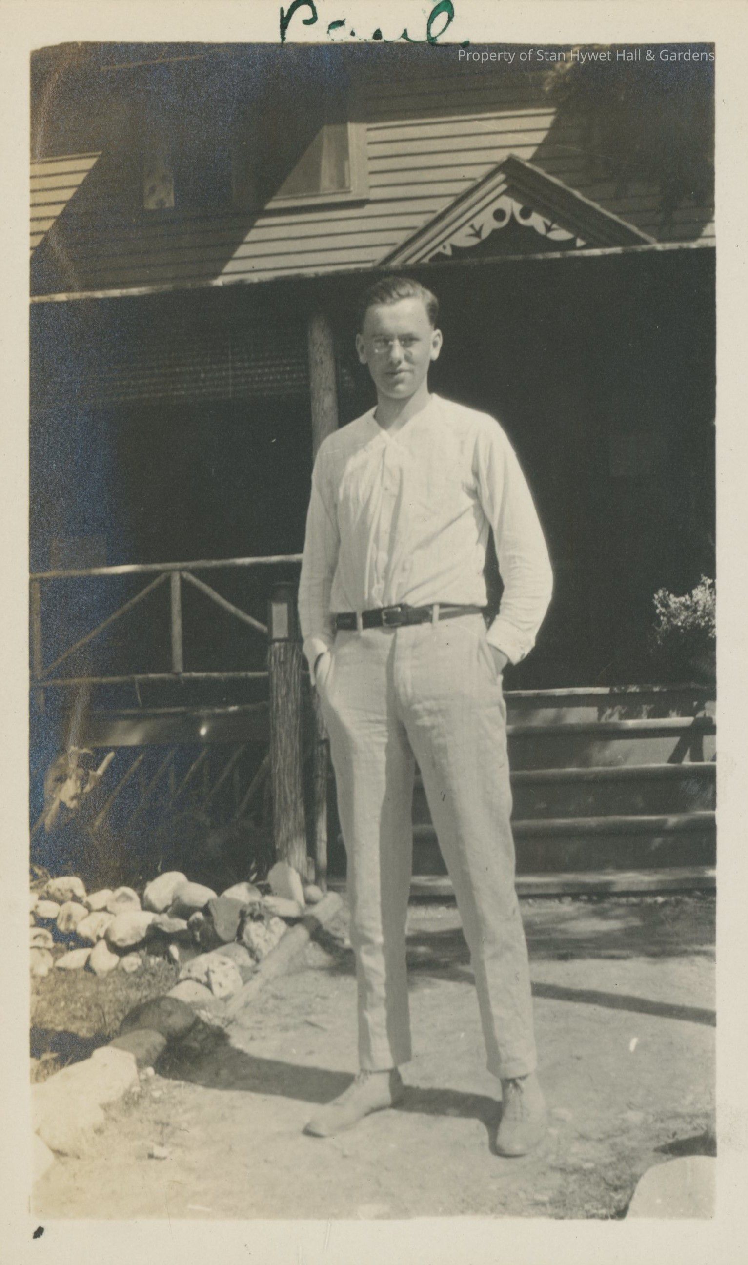 Black and white photographic print with white border. One of a series of 66 photos. Paul Litchfield standing on dirt path to cabin. Steps in background. He has on shirt with no collar. Hands in pockets of trousers with no cuffs and too short, light in color. Light high top shoes. His feet seem very long and narrow. He is wearing glasses. Gingerbread decoration above porch. Negative spots. At top hand written in green ink, "Paul".Photograph Details