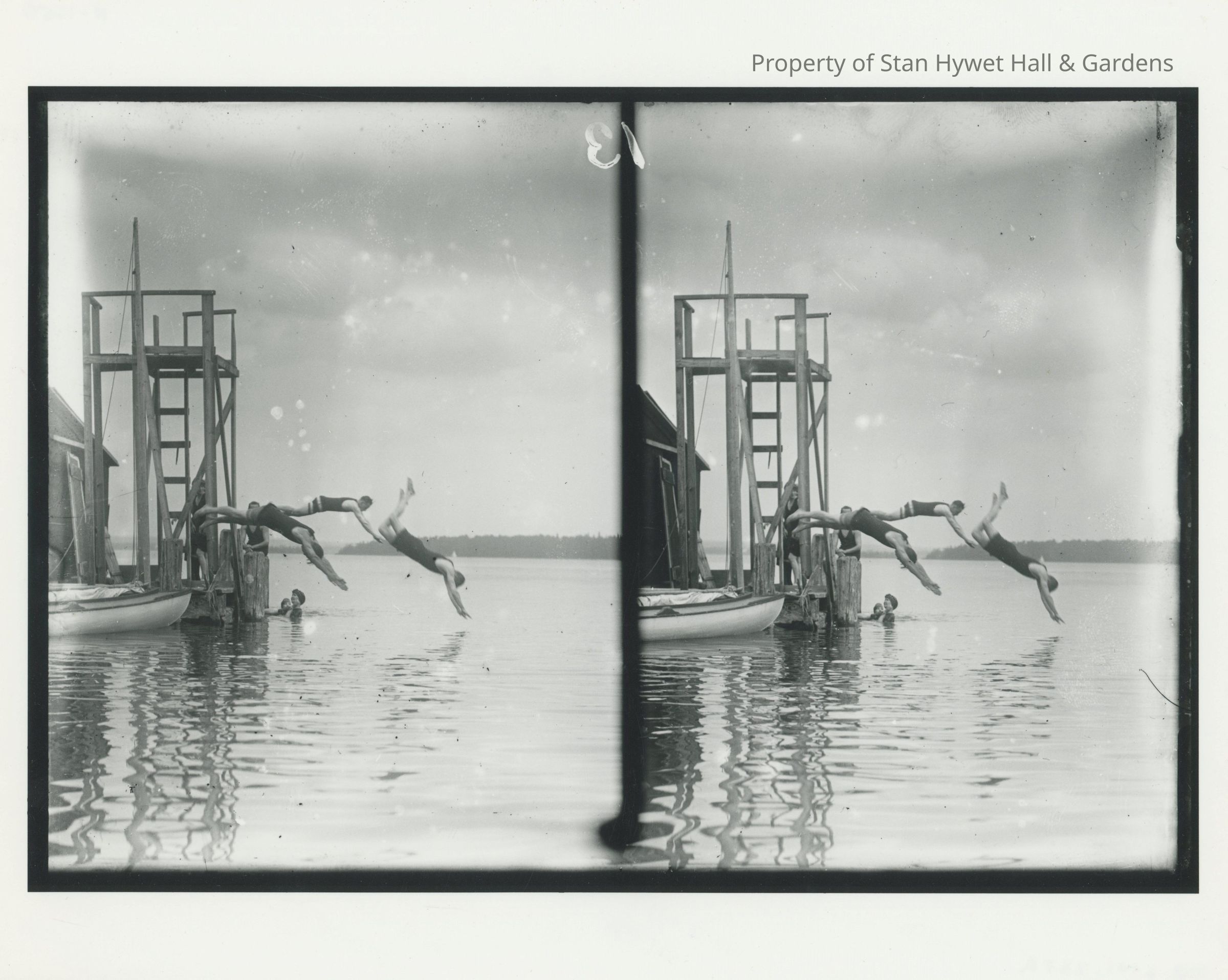 Black and white stereograph image of three unidentified young men swimming and diving from the dock at SunSands. Four unidentified people watch. Three divers in mid-air, two onlookers in water and two sit on bottom of wooden diving platform. All wear dark swimsuits. Diving platform, part of boathouse, and portion of sailboat visible in left side of image. Divers in mid-air in center and wooded land in far middle ground.Photograph Details