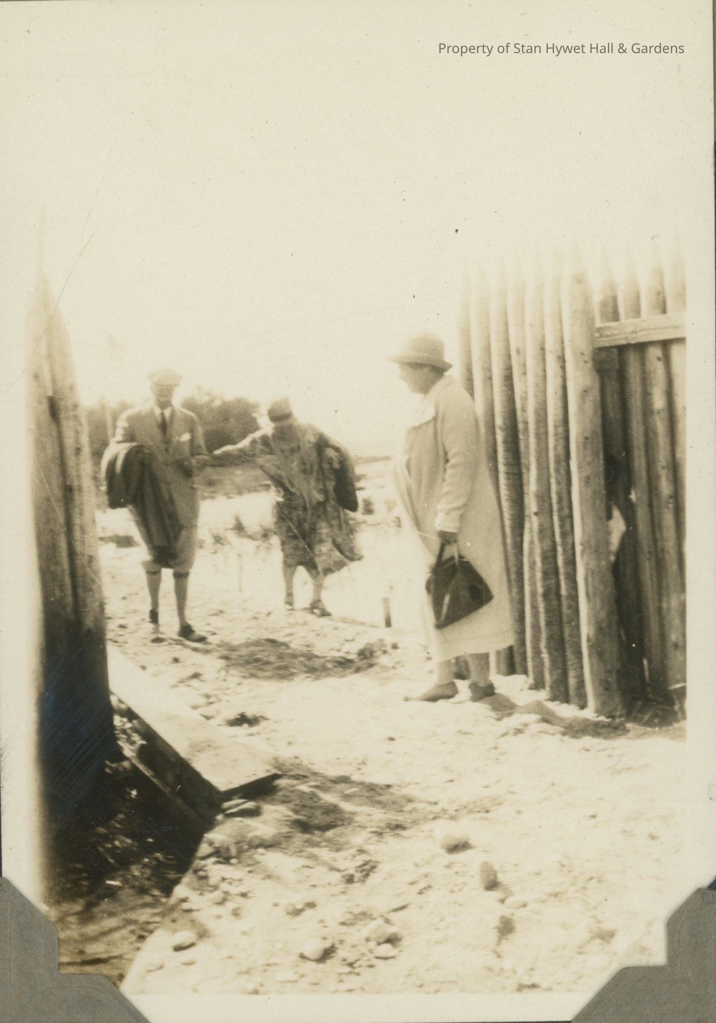 1 of 3 black and white photo print/snapshots attached by gray photo corners to a single black photo album page, all are slightly hazy. Print of one man and two women walking through log gateway. Mrs. Seiberling in center of photo dressed in floral dress and light hat; she is bent over with proper right arm extended and holding arm of man; proper left arm is holding a dark purse. Unidentified woman to left of photo standing in front of large wooden gate door; dressed in light colored coat and hat, holding dark purse in proper left hand. Unidentified man to left of photo dressed in light colored suit, dark tie, and light colored cap, holding coat in proper right arm. Wooded area and sky in background.Photograph Details