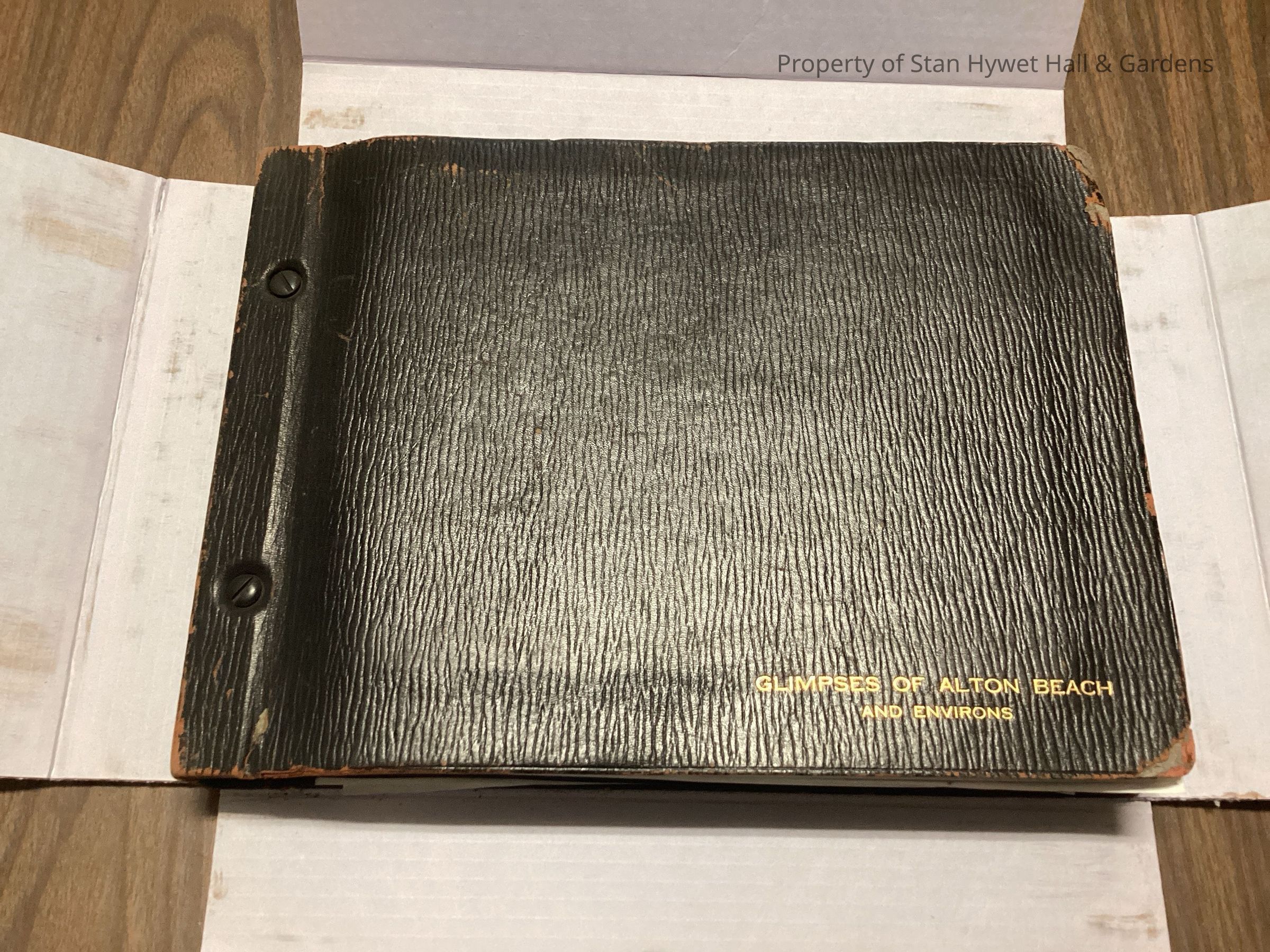 Black leather scrapbook with wavy texture and “Glimpses of Alton Beach and Environs” typed at the bottom in gold lettering. The interior has a variety of images taken of locations around Alton beach.Collection