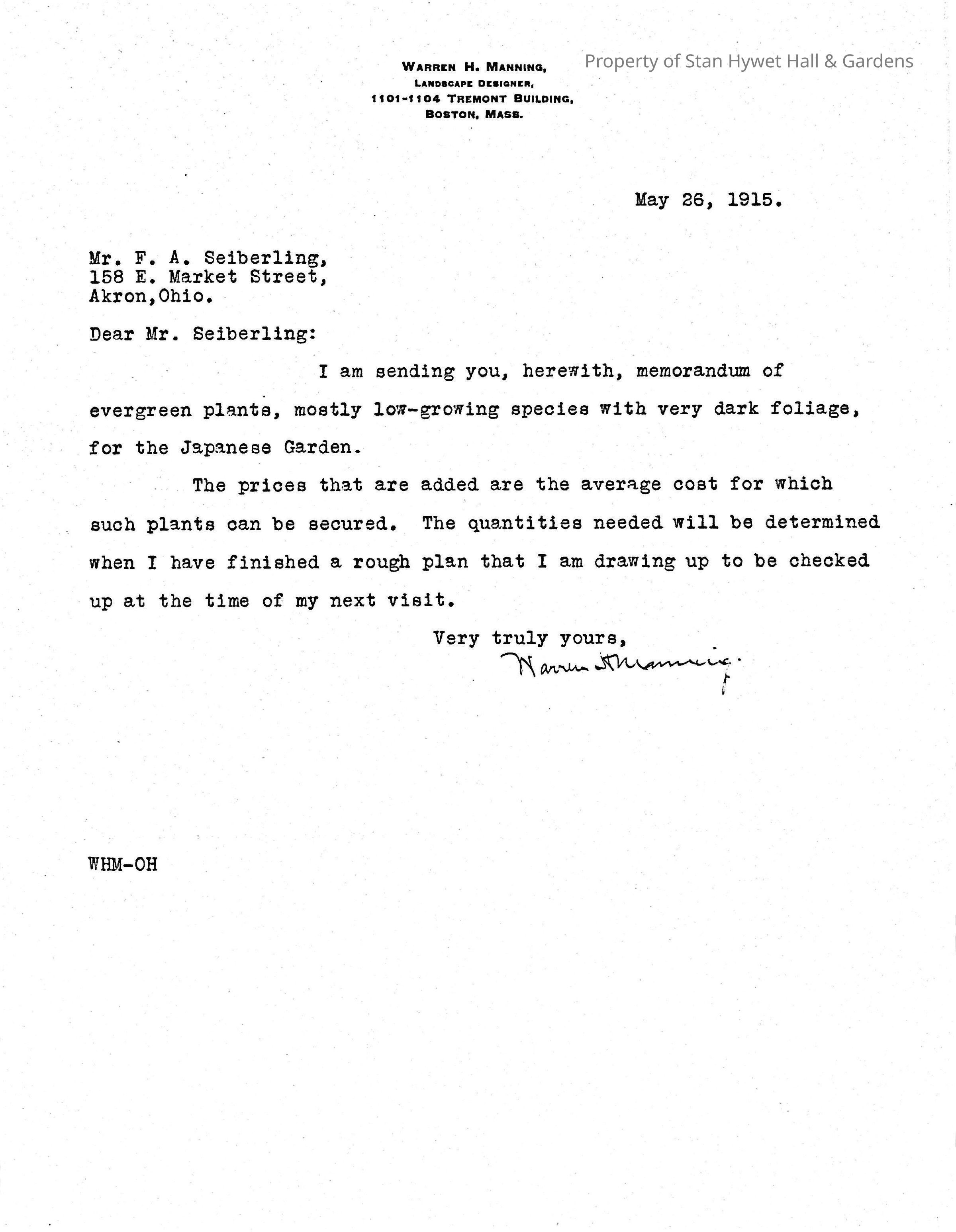 Typewritten list on Warren H. Manning letterhead, written to Mr. Frank A. Seiberling, Akron, Ohio and dated May 26th, 1915. Detailed list of plantings for the Japanese Garden including common and Latin names, sizes, and prices. Includes a letter from Warren Manning stating he will be verifying quantities of each at his next visit.Subject