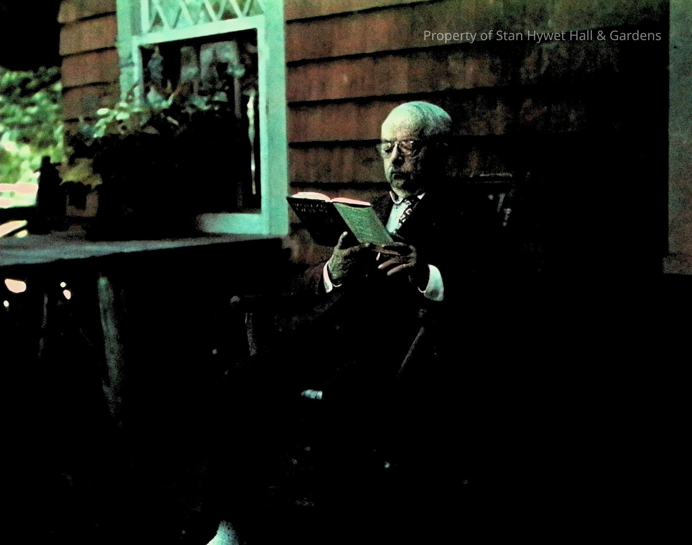 Color photographic print (borderless, glossy) of F.A. Seiberling seated in a rocking chair on the porch at Cedar Lodge. FA is dressed in a suit with vest, necktie, and spats on his shoes. He is wearing spectacles and reading a book. There is a table on the left with potted plants.Photograph Details
