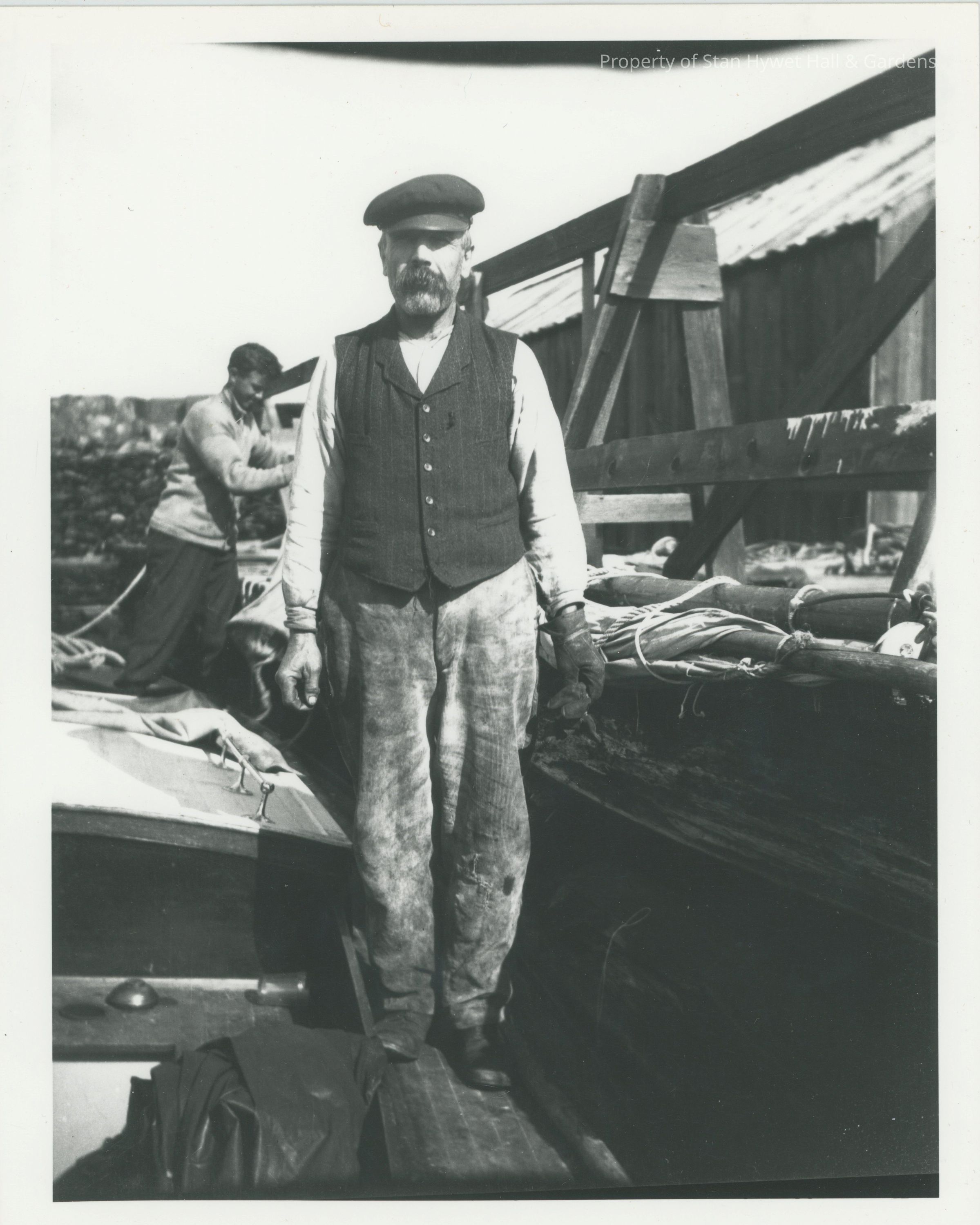 Black and white photograph of 2 men on a boat. The one in center view is very dirty and has a beard. The one in the back is not looking at the camera and appears to be busy with something.Photograph Details