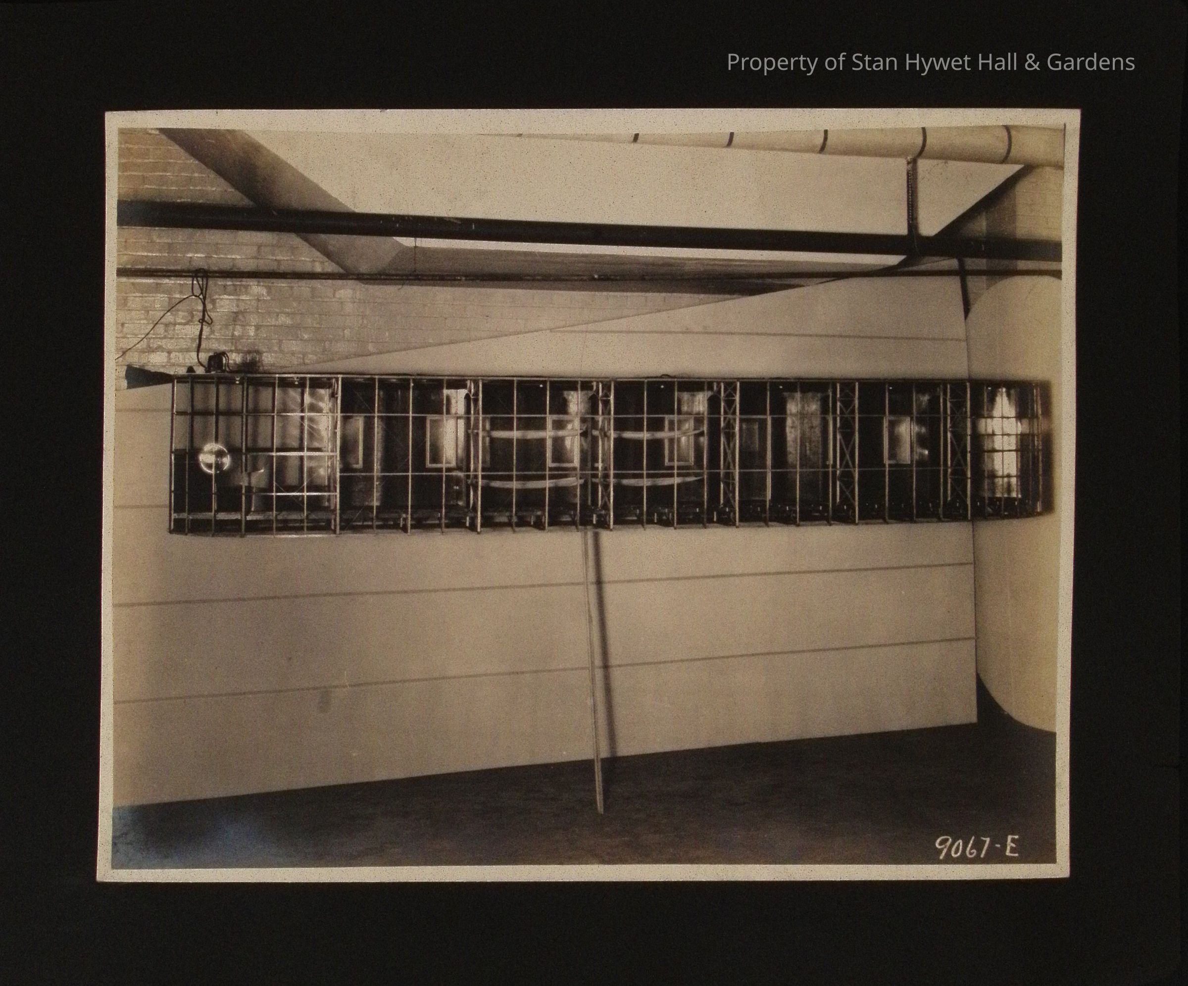 Black and white photograph of interior of prototype of airship gondola. Cage like construction using metal rods. Gondola mounted on a wall. Pipes and air ducts running along ceiling above gondola.