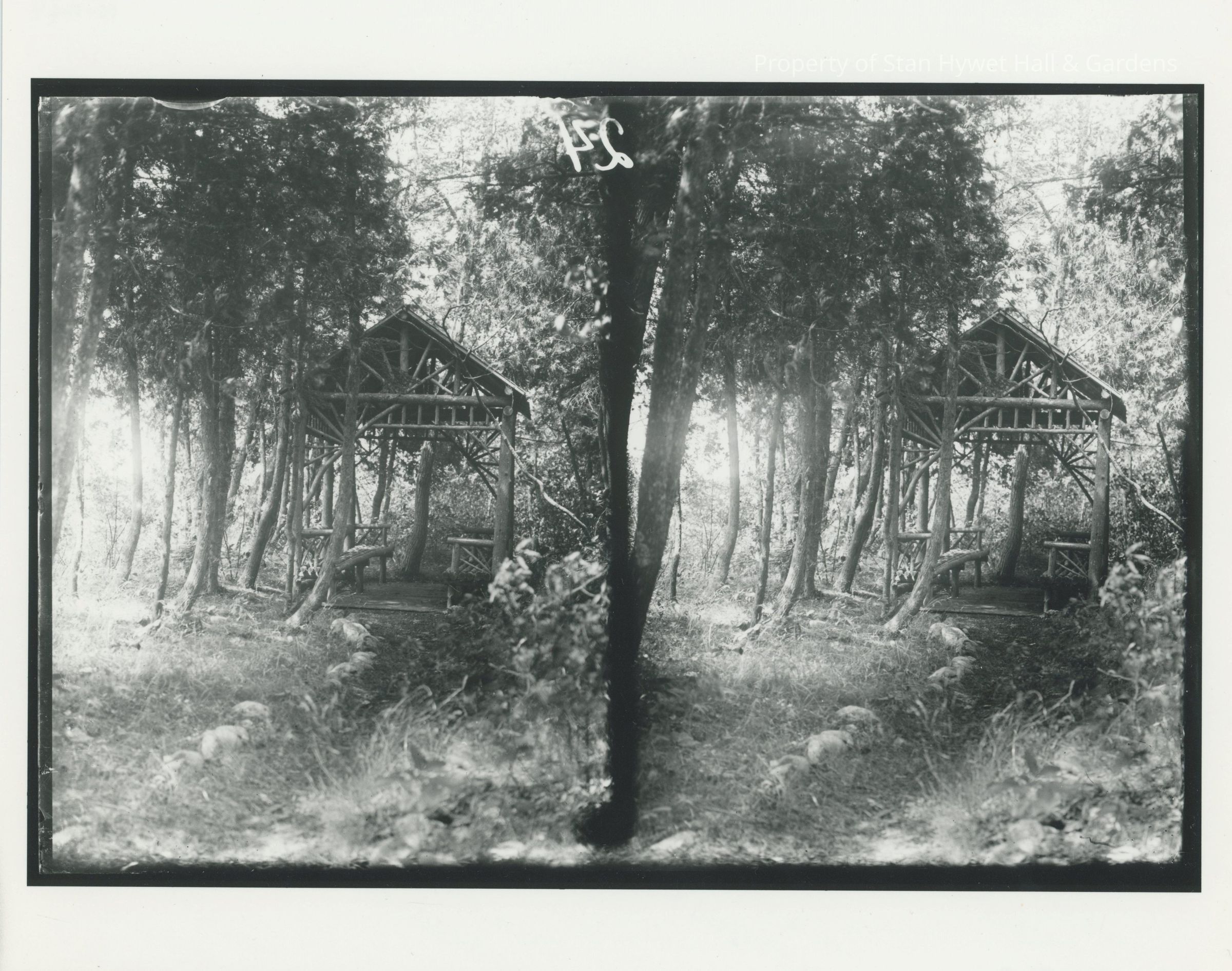 Black and white stereograph of a gazebo in the woods at SunSands. Foreground has a small dirt path lined with rocks leading into the background and the gazebo. The gazebo is in the background surrounded by trees. The gazebo is wooden and has two benches on the left and right. Series of Camp SunSands prints.Photograph Details