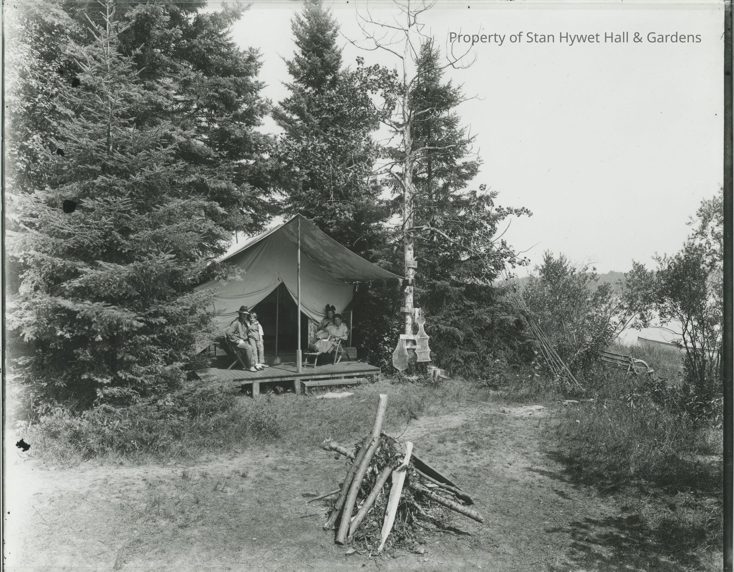 Black and white photograph of 4 people on the deck in front of a large tent at Camp Wildwood. Group includes Dr. William Sabin Chase and Grace Seiberling Chase with their daughters, Ellen and Olga. Dr. Chase at left seated with Olga standing, Grace Chase at right with Ellen. Wood stacked for bonfire in foreground. View of lake with canoe to distant right side, nets hung on tree to right of tent. Wooded area.Photograph Details