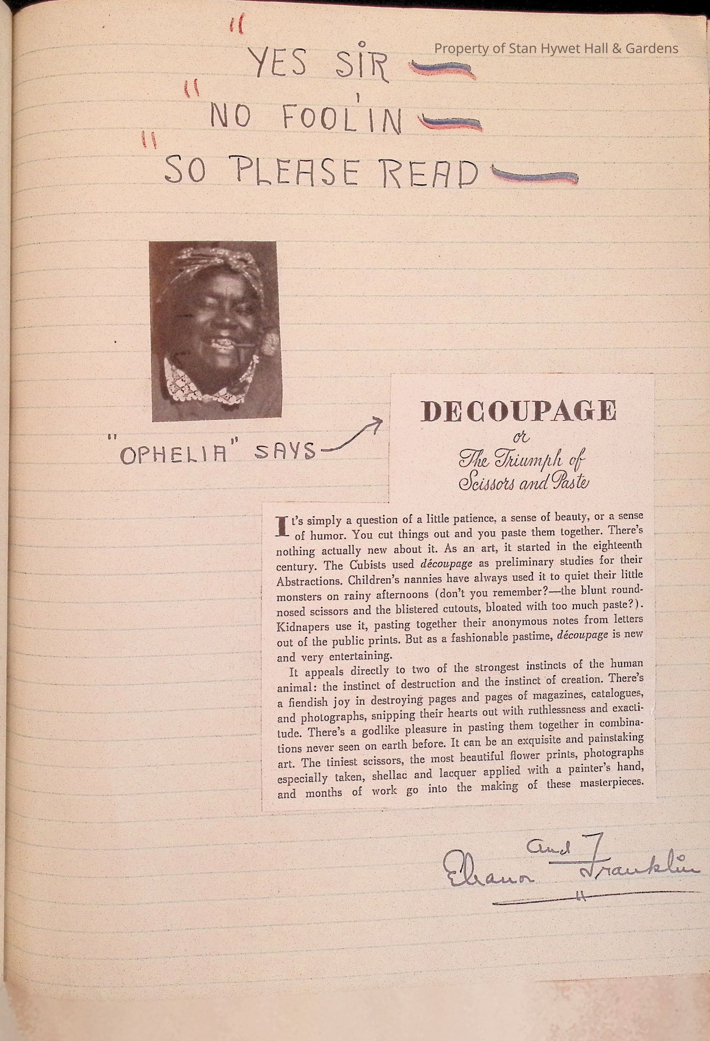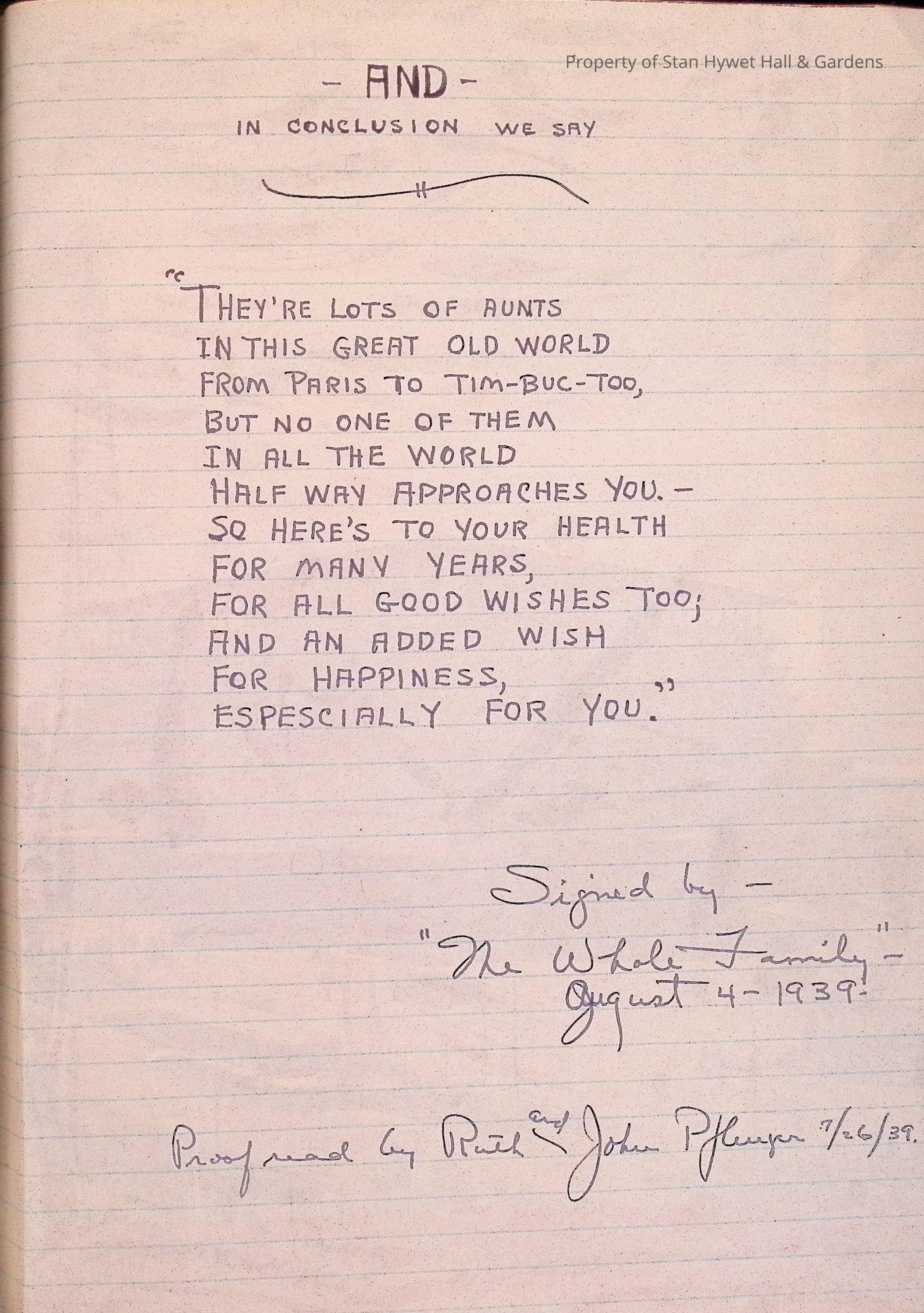 Scrapbook created for Cora Seiberling on the occasion of her 77th birthday on 8/4/1939. The cover includes a by line of "Franklin Delano Roosevelt and Eleanor Roosevelt" however the last page indicates it was created by "the whole family".Collection