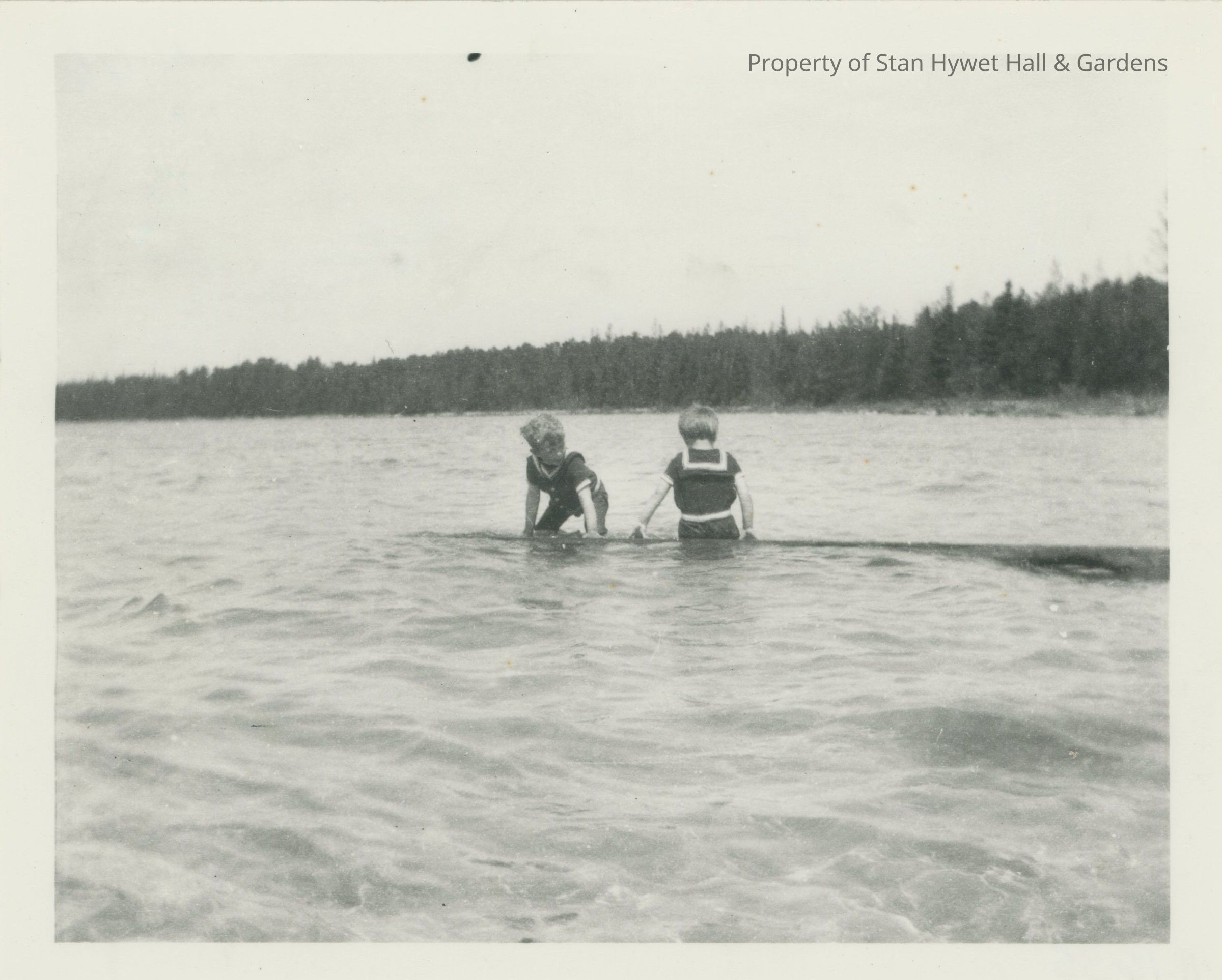 Black and white photographic print. Two children in sailor suits style bathing suits sitting and kneeling on a log in Lake Huron. Shore and trees in background. Child on right facing away from camera. Child on left on hands and knees facing camera.Photograph Details