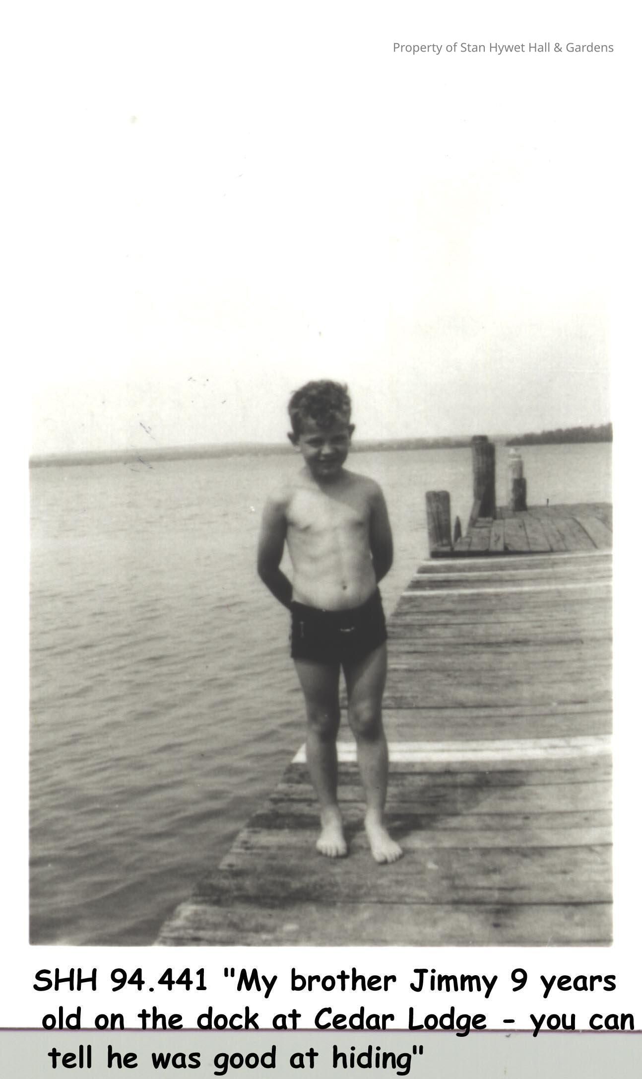 Black and white photographic print of a young boy (Jimmy Koger) standing on a boat dock which extends from bottom of image diagonally to the right. Dock which extends from bottom of image diagonally to the right. Dock is constructed of wooden planks with three wooden piers at the far end on the right. Water surrounds on left and at background with land visible at horizon level. Boy stands facing camera with both hands behind back, wearing dark swimming trunks or shorts, feet are bare, short medium dark hair, appears to be smiling at camera as well as squinting in the sunlight. Jimmy was the son of Nellie Racey Koger (b. 1904) who was the Seiberling's cook at Stan Hywet Hall. Handwritten on the back in ink "My brother Jimmy/ 9 years old on/ the dock at Cedar/ lodge. You can tell/ he was good at/ hiding."Photograph Details