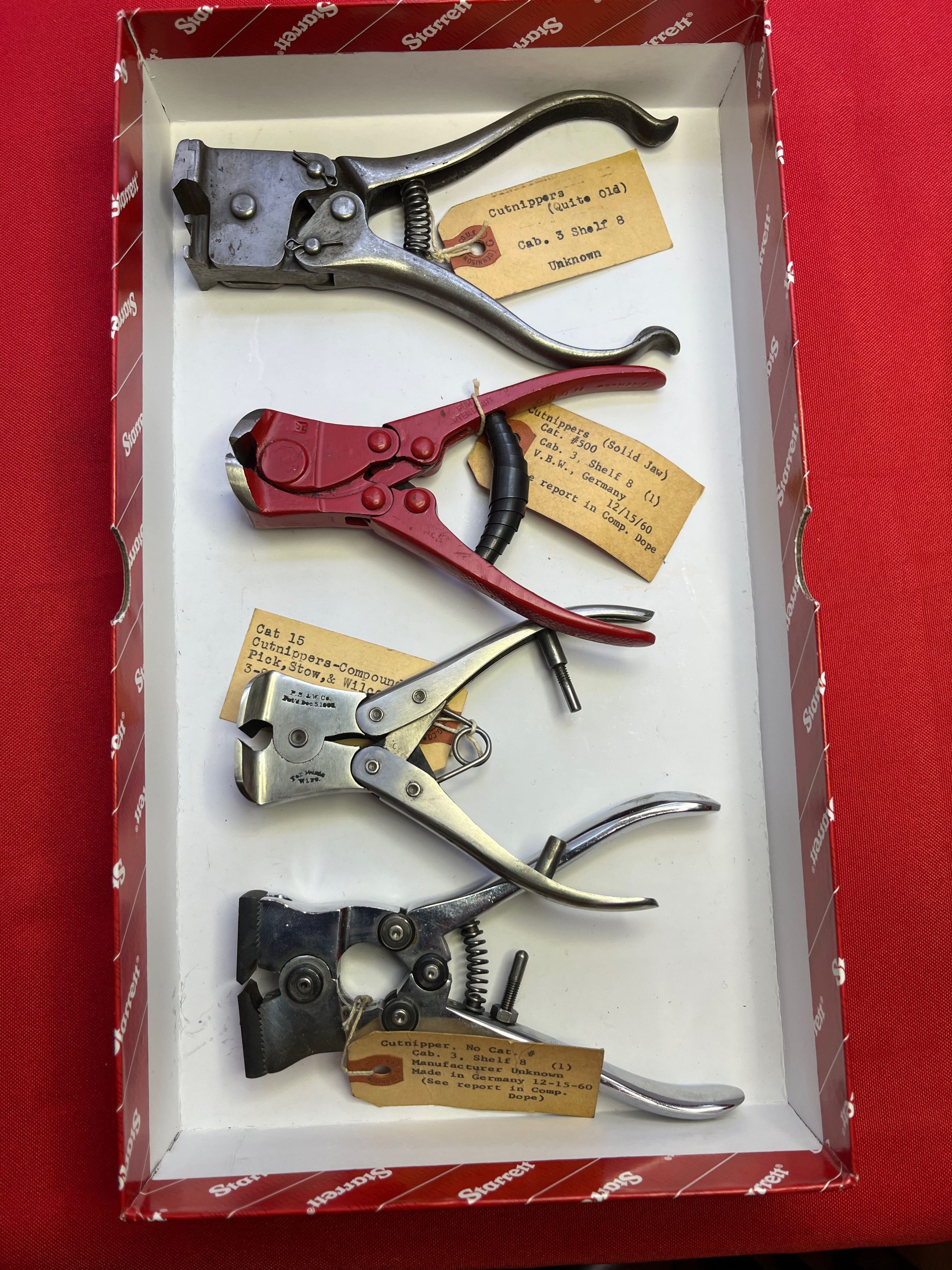 From Top: 1. Quite Old Unknown.; 2. Solid Jaws V.B.W. Nr. 500, DBGM Germany.; 3. P. S. & W. Co. Peck, Snow & Wilcox Cat 15 For Music Wire, Pat"d Dec. 5, 1893.; 4. Cut Nipper made in Germany 12-15-60 Unknown.