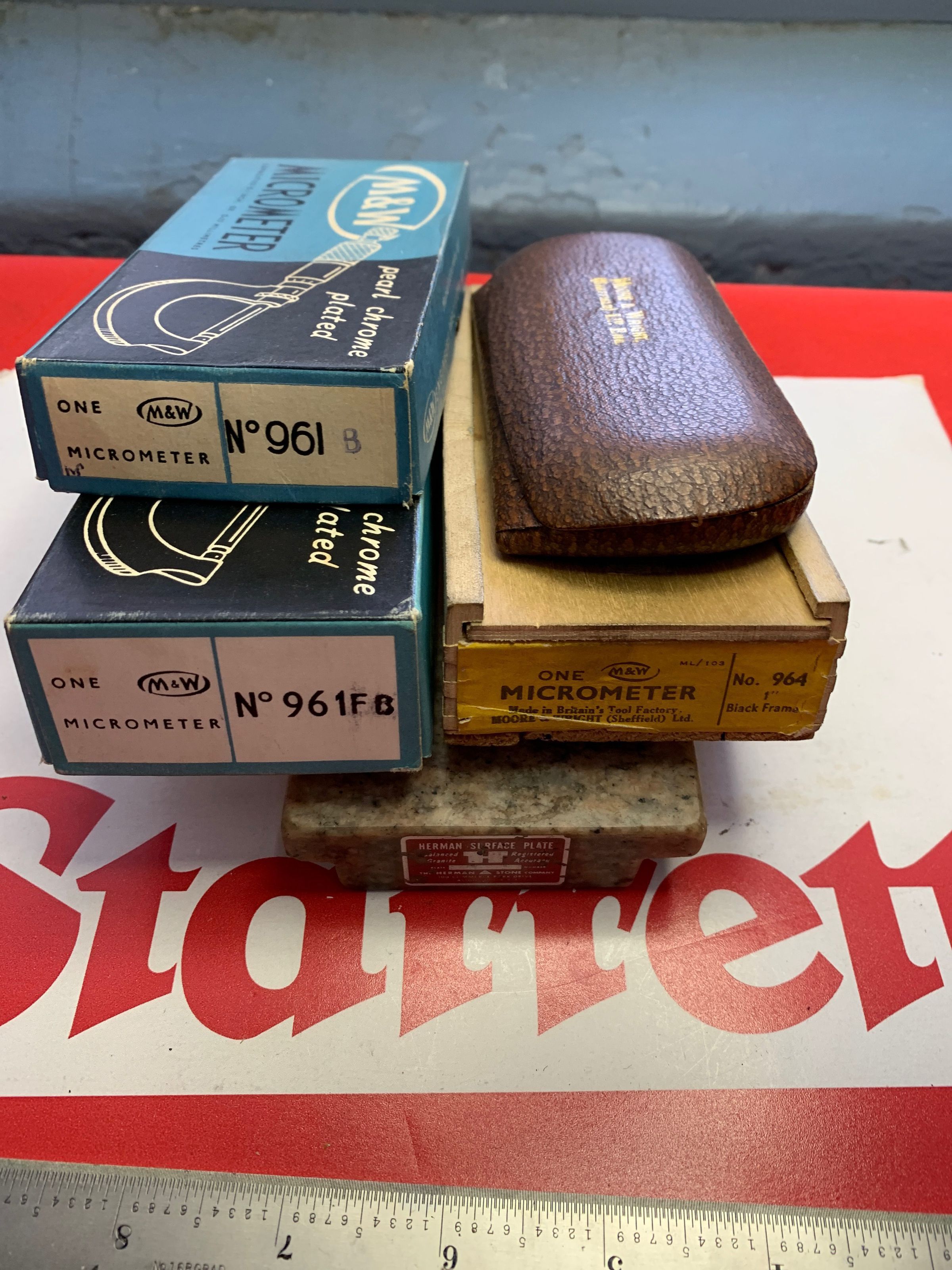 Three Micrometers Parts #961B, #961FB, (1959), #964 (1944) and one case empty