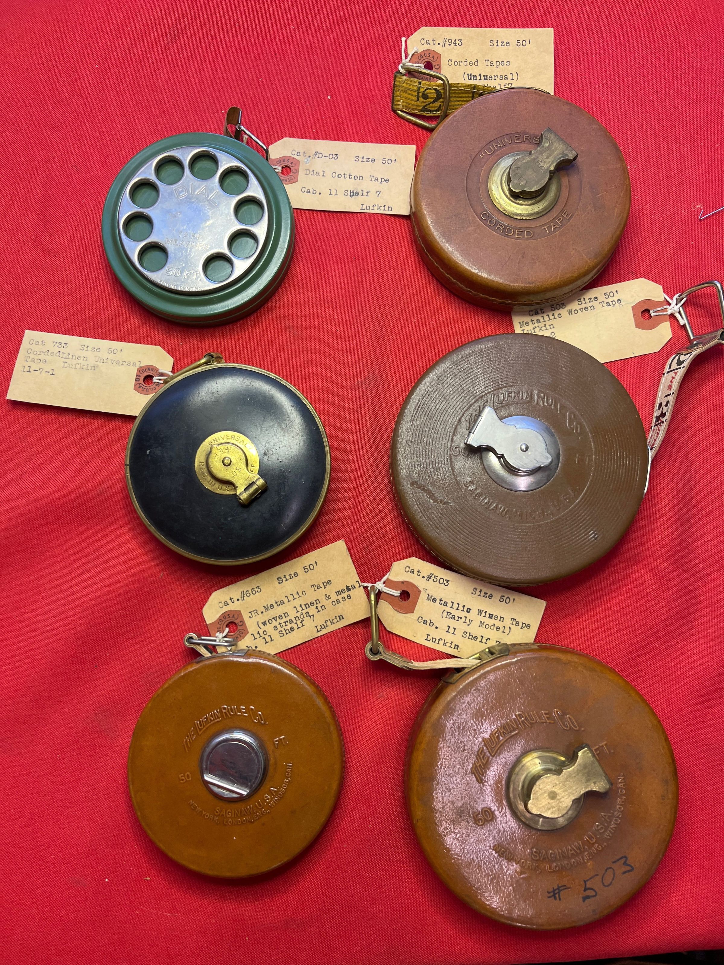 Left Side: 1. No. D-03 Dial Cotton Tape 50'; 2. No. 733 Corded Linen Universal 50'; 3. Junior Metaallic (Woven Lines w/metal strands); 2. No 943 Universal Corded Tape 50'; 3. No. 503 Improved Metallic (early model) Woven