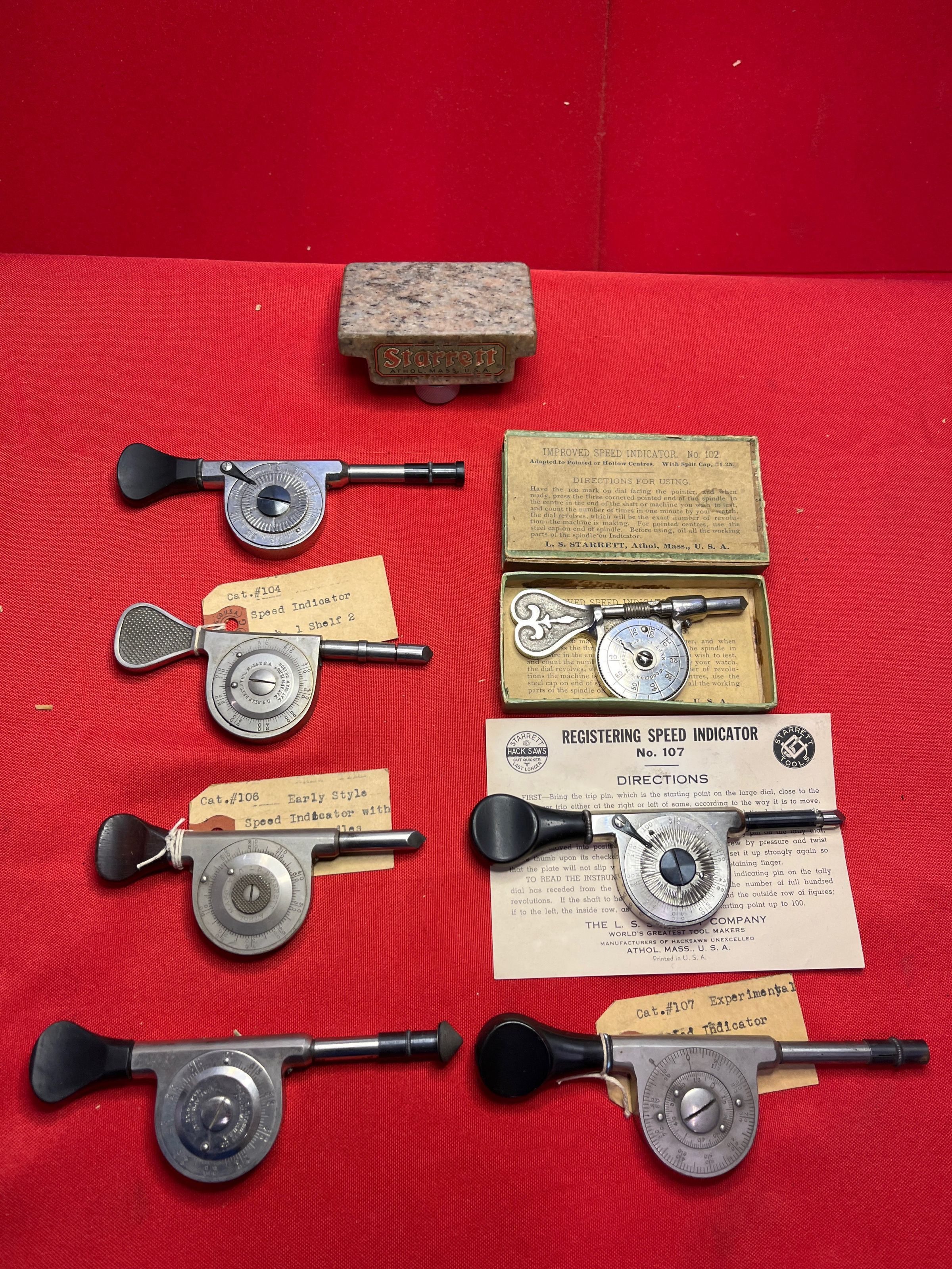 Left; Top 1. No. 107,; 2. No. 104 Pat. Apr. 13, 1897, Pat. Mar. 28, 1905; 3. No. 106 Early Style, Stamp L. S. Starrett Athol Mass U.S.A. Pat. Appld. For; 3. No. 106 Pat. Apr. 13, 1897, Pat. Mar. 28, 1905; Right; Top 1.Improved Speed Indicator No. 102 Woodman's Patent,Sept. 12, 1876; 2. Registering Speed Indicator No. 107; 3. No. 107 XP Pat. Mar. 31, 1896.