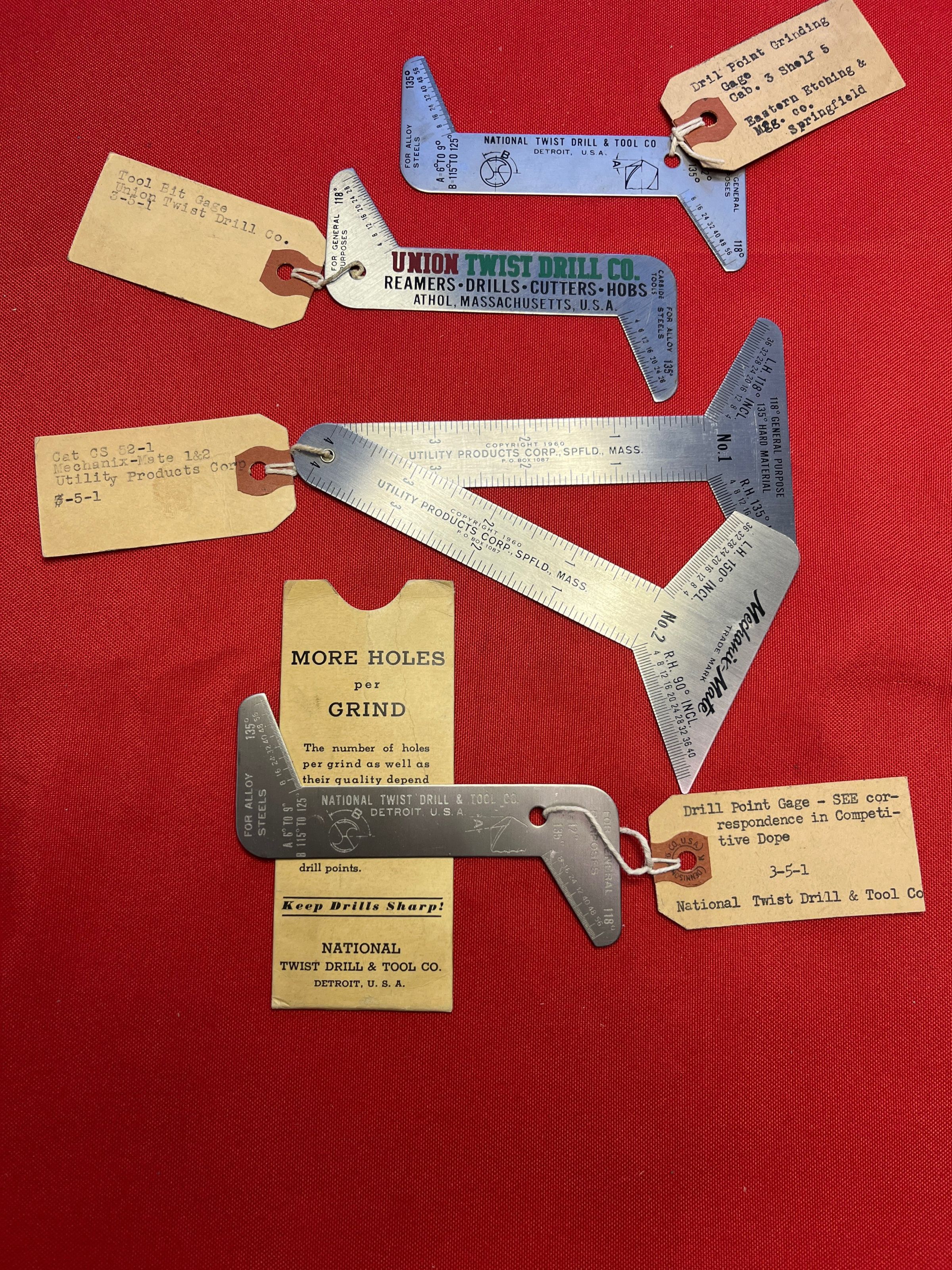 1. National Twist Drill & Tool Co. Detroit (Tagged Easter Etching & Mfg. Co., Springfield,; 2. Union Twist Dril Co., Athol Tool Bit Gge.; 3.Mechanix-Mate No. 1 & No. 2, Utility Products Corp. Spfld, Mass. Copyright 1960. 4. National Twist Drill & Tool Co., Detroit 1937