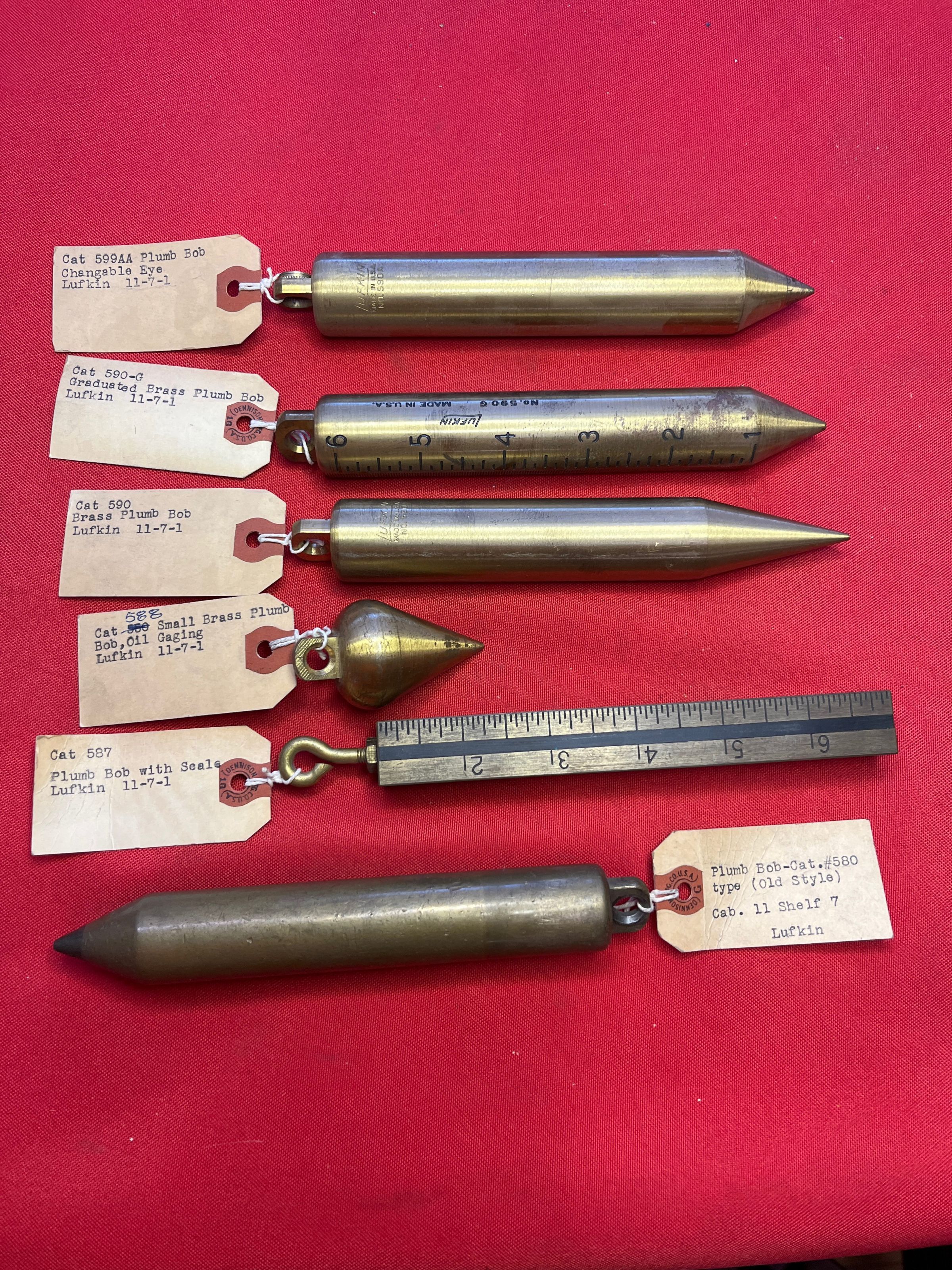 Top down: 1. No. 599AA Changable Eye; 2. No. 590G Graduated; 3. No. 590; 4. No. 588 Small Brass Oil aging; 5. No. 587 Plumb Bob with Scale Square; 6. No. 580 Type (old style)