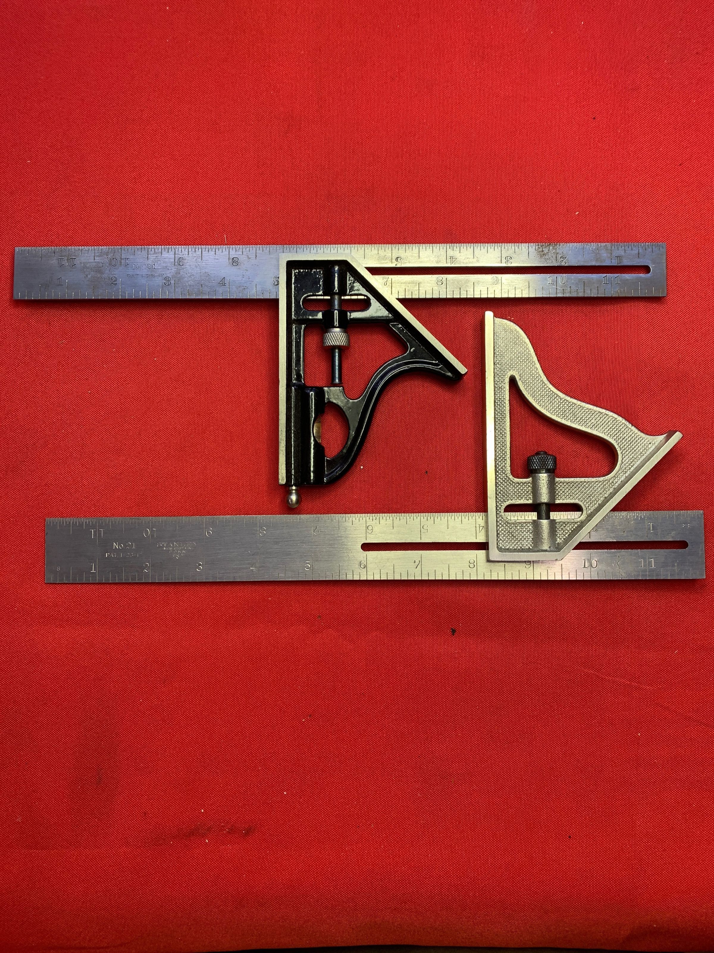 Two Stanley No. 21 Combination Squares. Black painted marked Pat. Pend and Pat. 1-23-17; Other No 21 stamped Pat. 1-23-17.