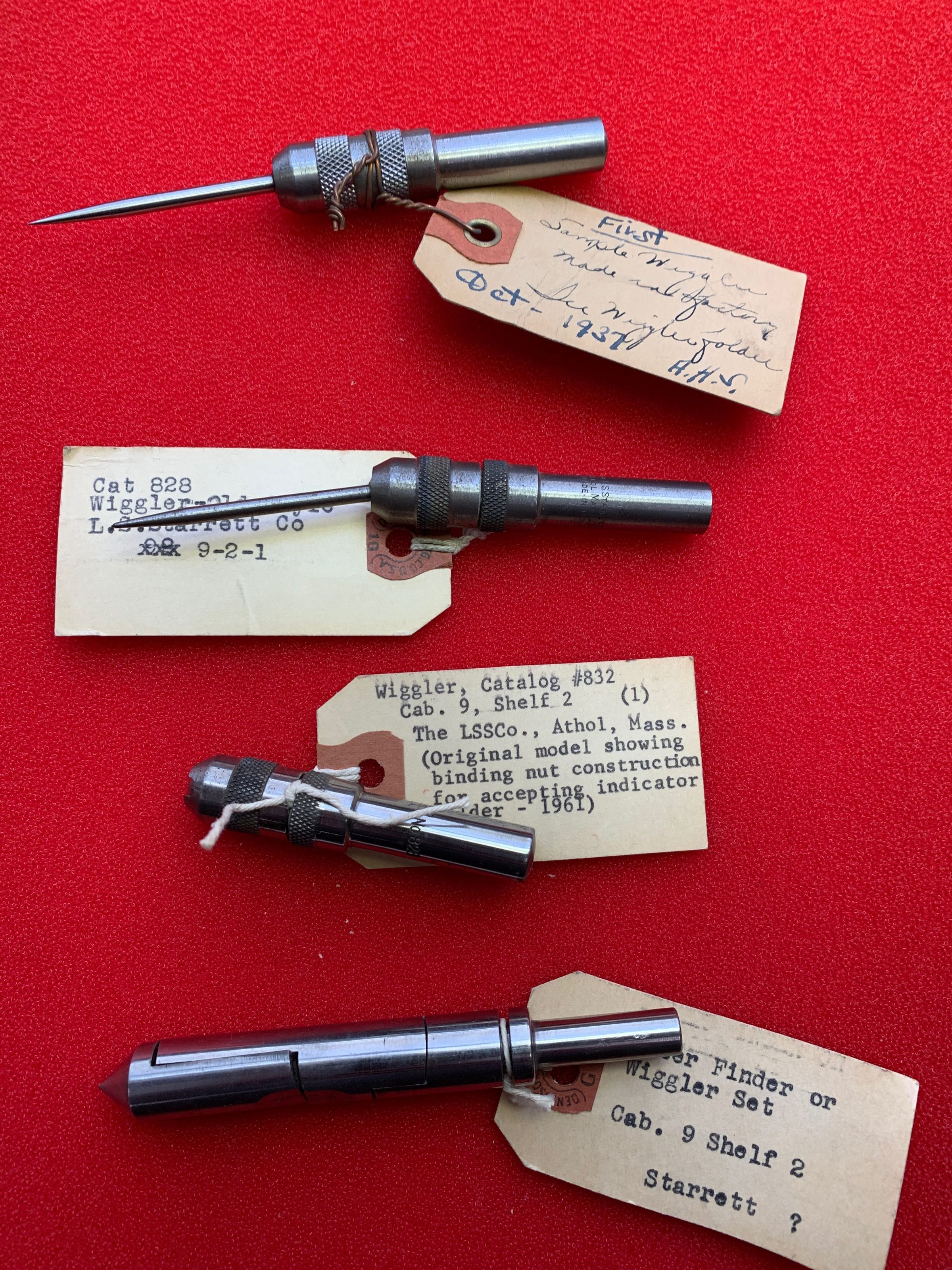 From Top: First Sample Wiggler (Oct. 1937); Cat. #828 Old Style (1938); Cat. #832 (1961); Center Finder or Wiggler Set
