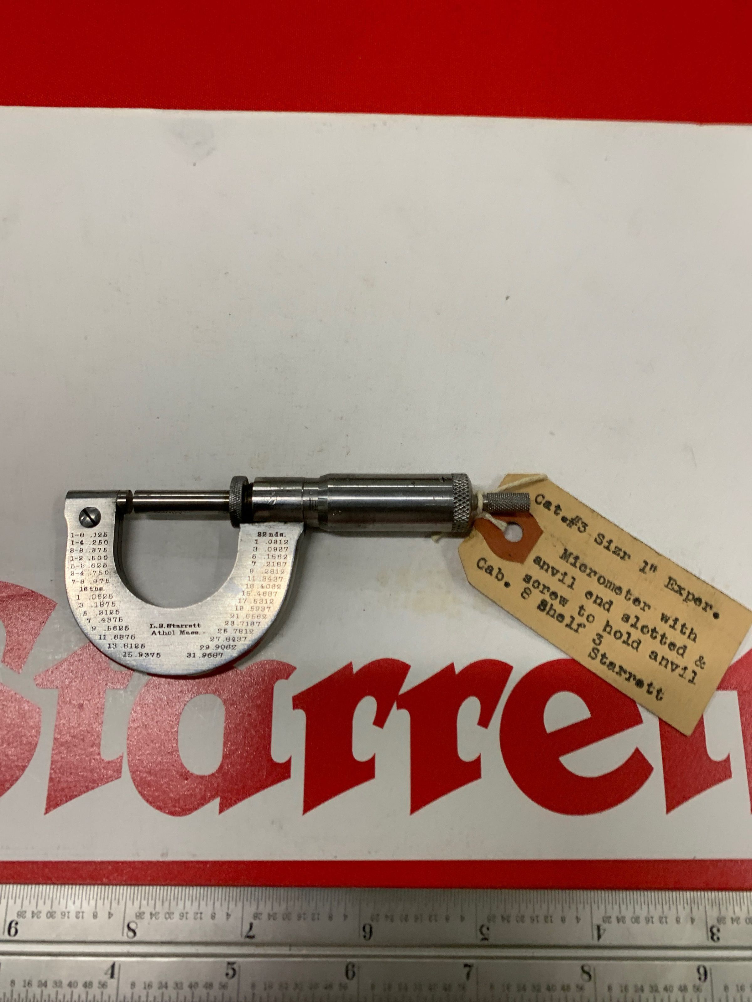 Micrometer with anvil end slotted and screw to hold anvil. All Micrometers before Catalog 15 had end slotted and screw to hold anvil. Also Stamped L. S. Starrett Athol Mass prior to 1895.