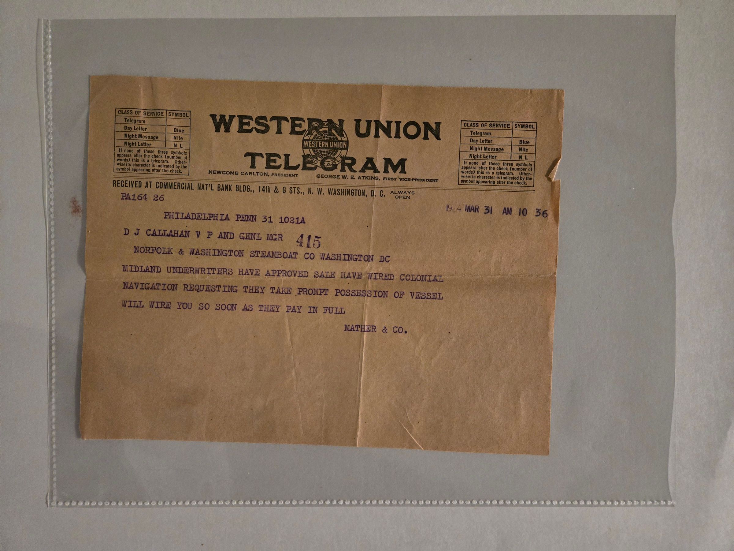 Telegram detailing the sale of the Midland (formerly the Newport News) from the Norfolk and Washington Steamboat Company to the Colonial Navigation Company. Found in envelope 2024.35.041.