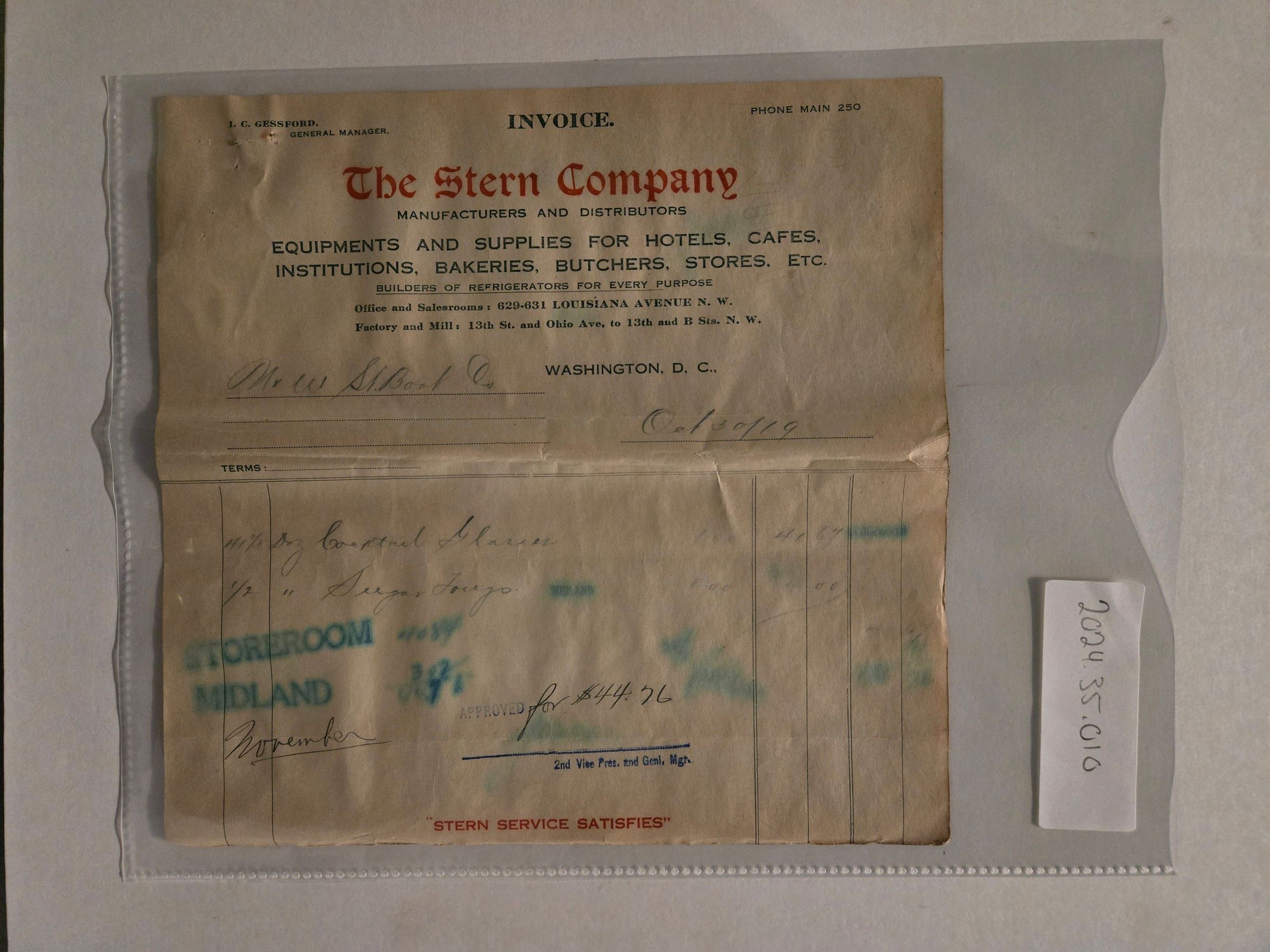 Invoice for the Norfolk and Washington Steamboat Company, items for the Steamer Midland (formerly the Steamer Newport News). Includes a line item for 500 cocktail glasses for $41.67. Originally found in envelope 2024.35.003.
