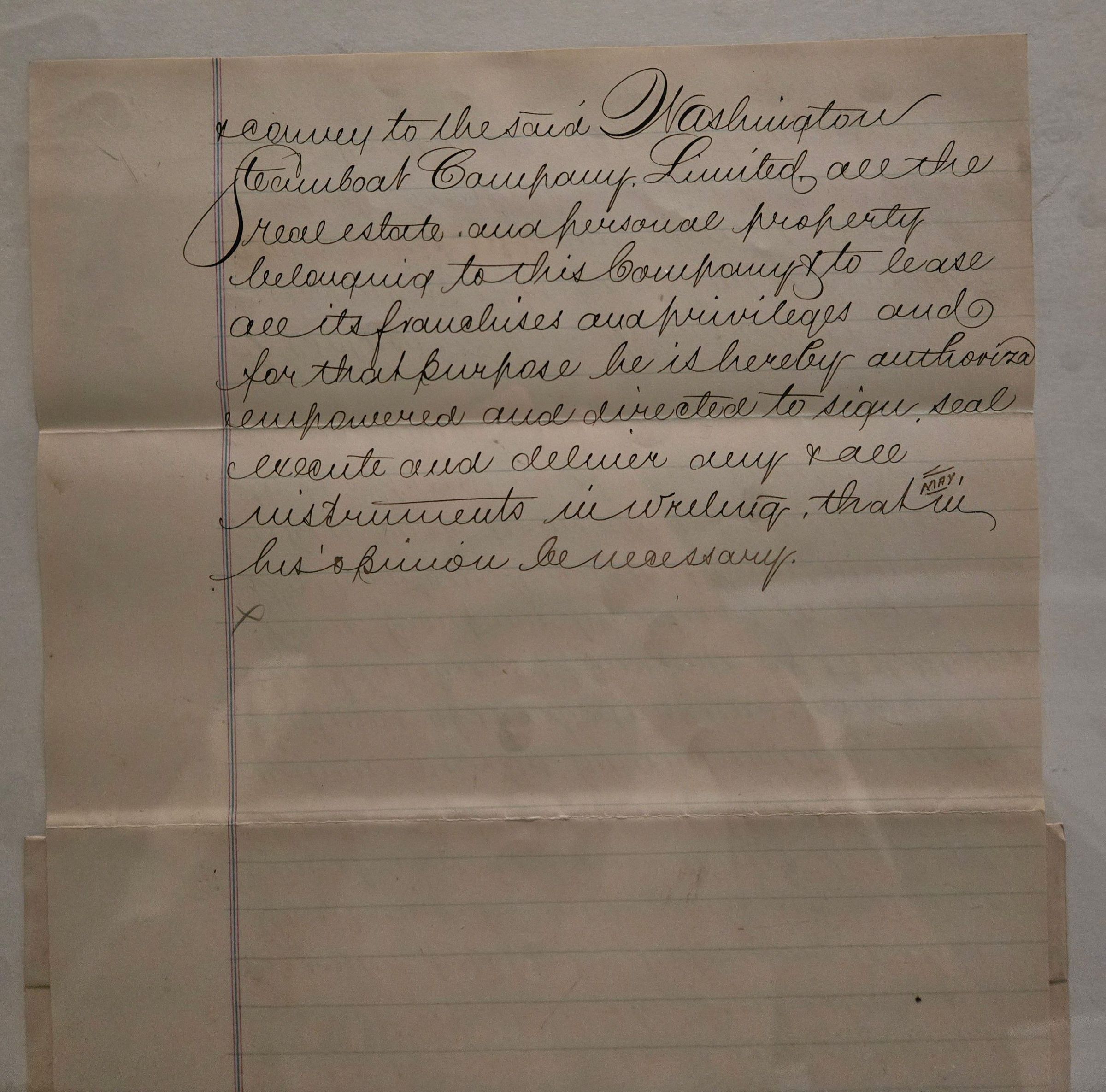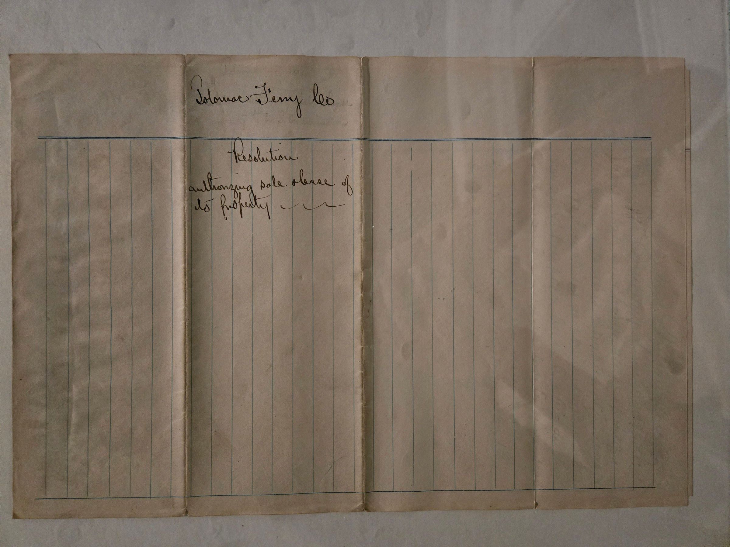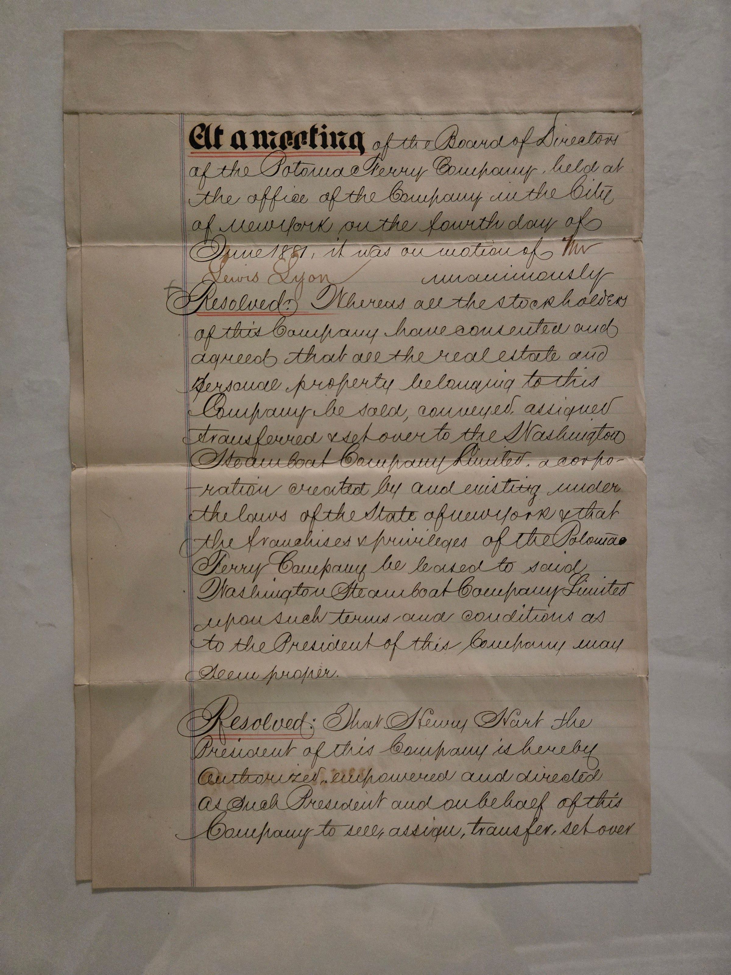Minutes from a meeting of the Potomac Ferry Company, transferring all property to the Washington Steamboat Company (probably also known as the Norfolk and Washington Steamboat Company), and leasing all rights and privileges to the same.
