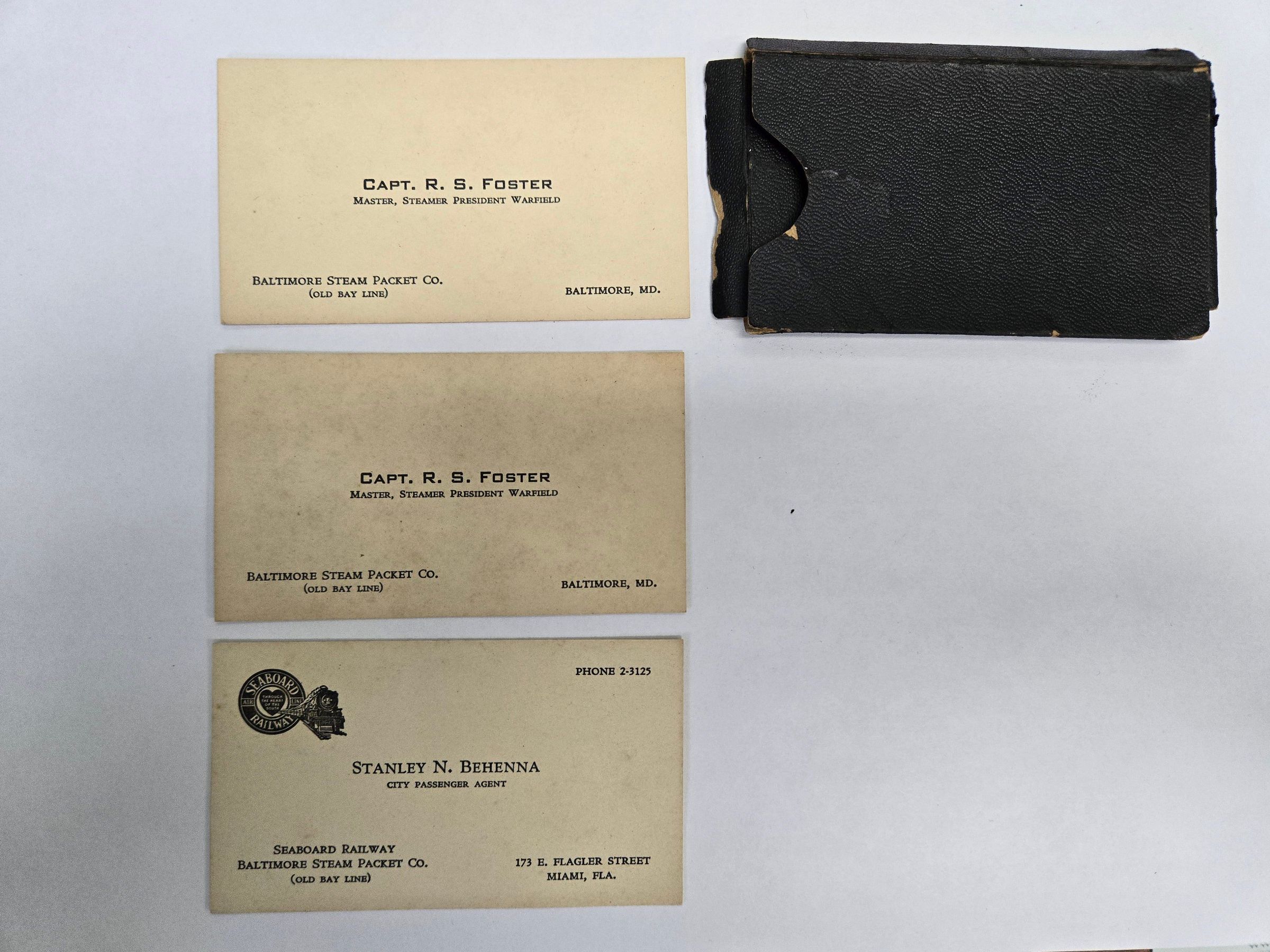 Business cards and holder from Captain Robert Foster of the Old Bay Line while he was Captain of the President Warfield. Also included is a card for Stanley N. Behenna of the Seaboard Railway.Exhibition