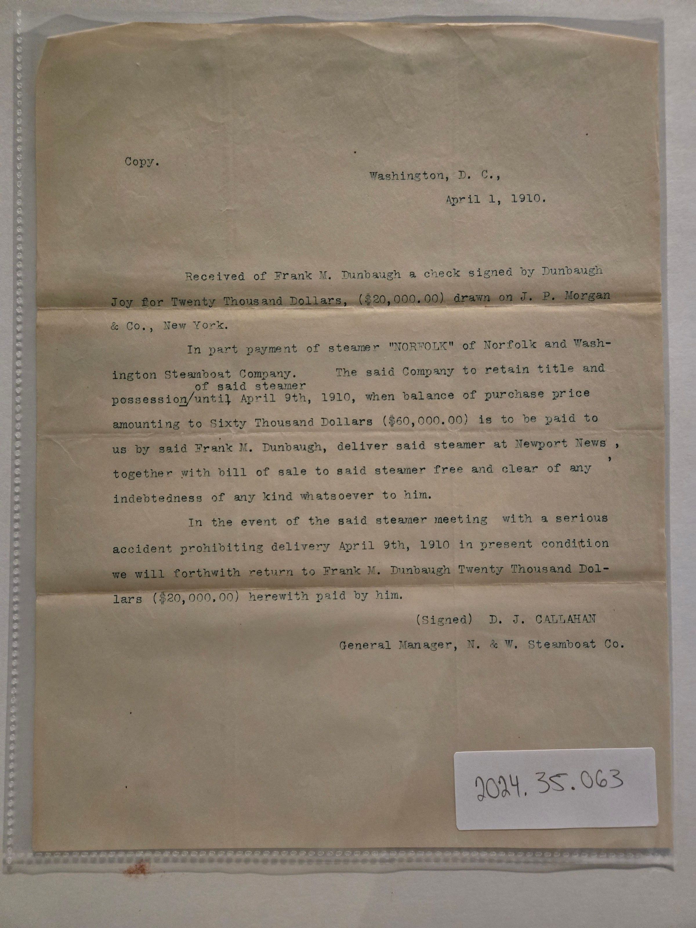 Letter regarding the sale of the Steamer Norfolk to Frank M. Dunbaugh from the Norfolk and Washington Steamboat Company. Found in envelope 2024.35.048