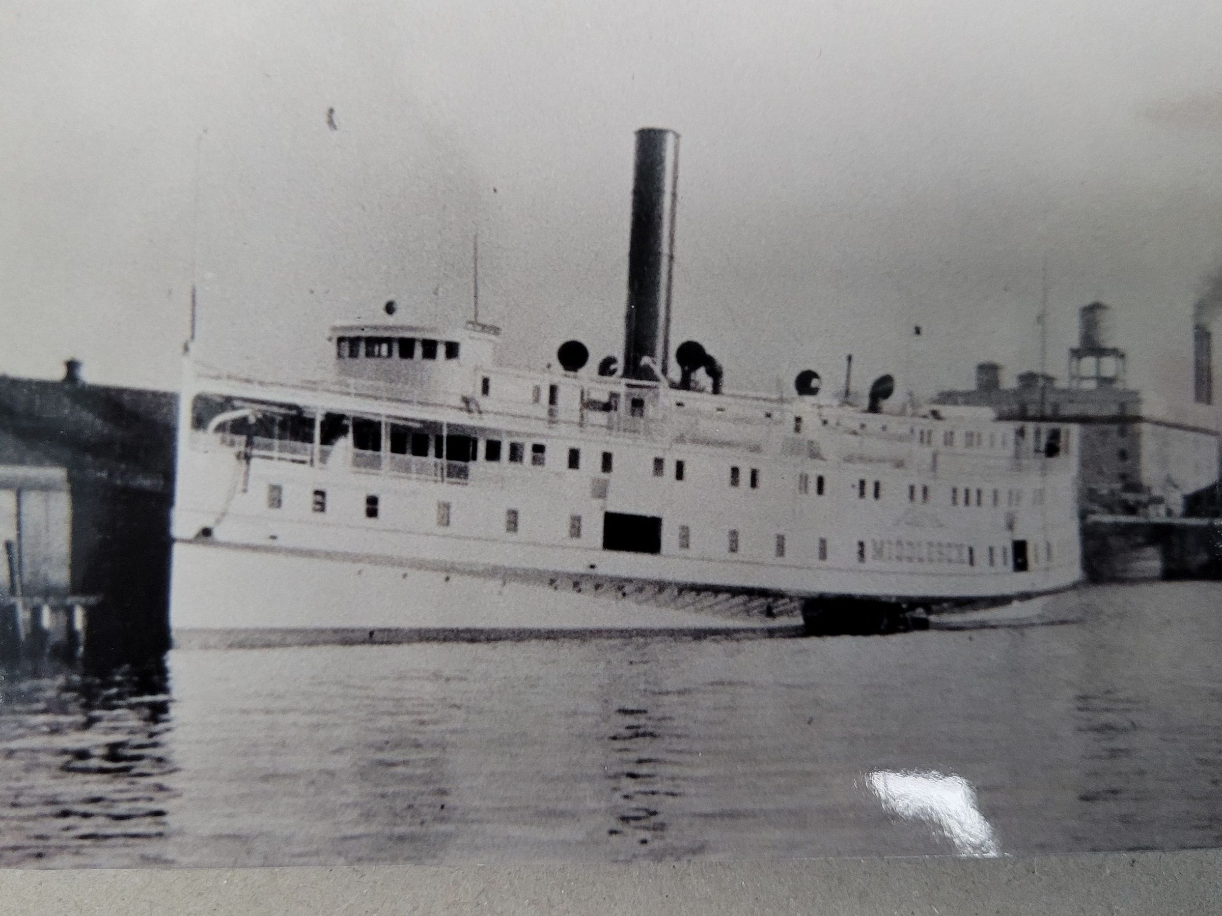 "Middlesex" Approaching Wharf Steam coming from Factory in Background Black & White Empty Deck