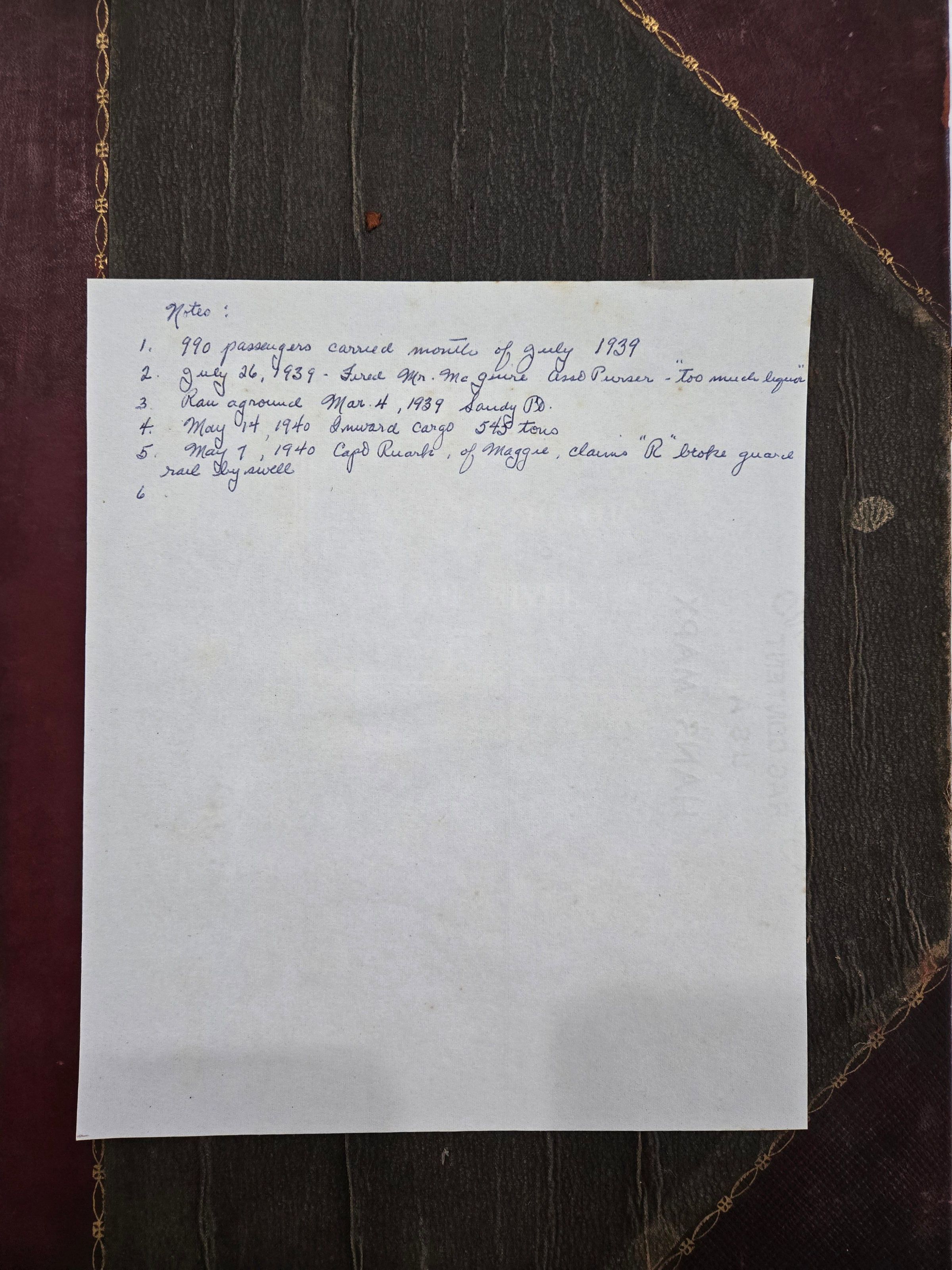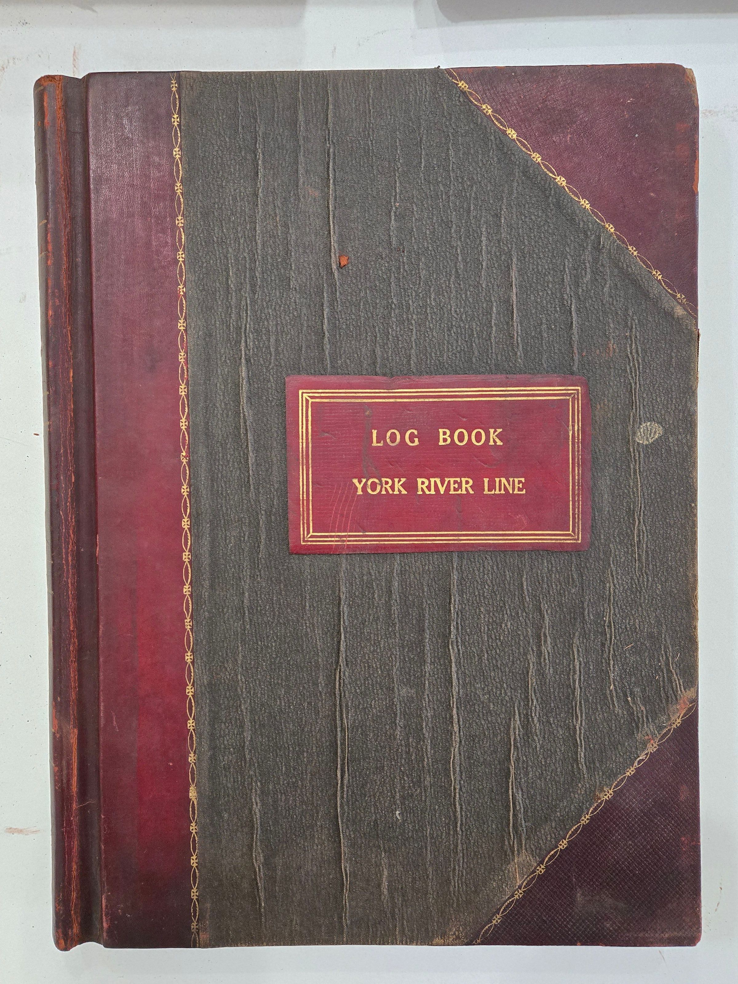 Logbook from the Chesapeake Steamship Company for the York River Line (Baltimore to West Point) from their steamer "City of Richmond." Entries begin February 20th, 1939, and end May 14th, 1940. Second photo includes notes made by Hans Marx about the contents of the book.