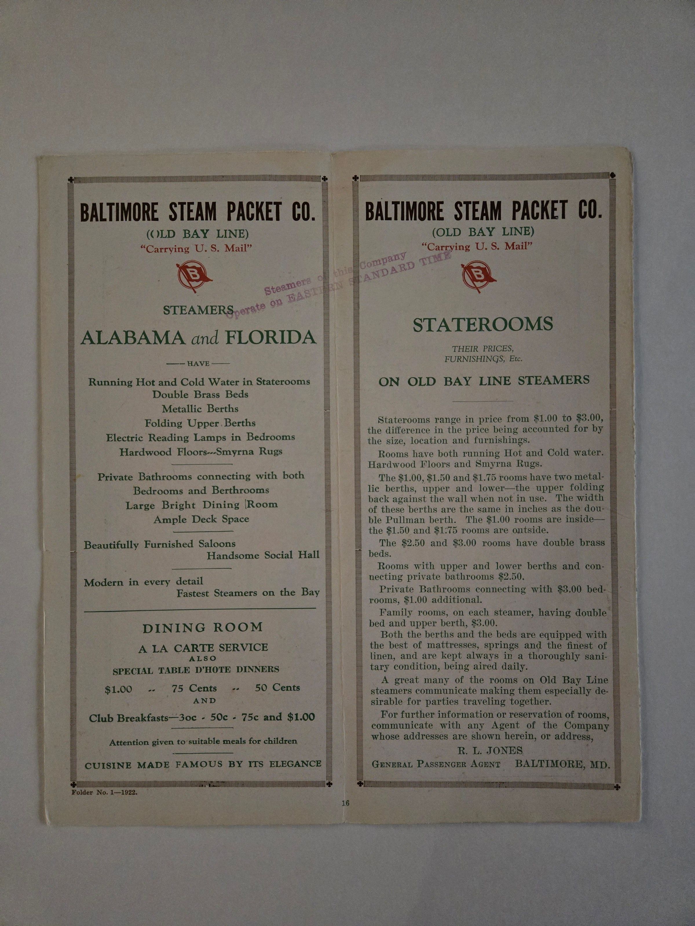1922 Pamphlet from the Old Bay Line advertising service on the steamers Alabama and Florida.