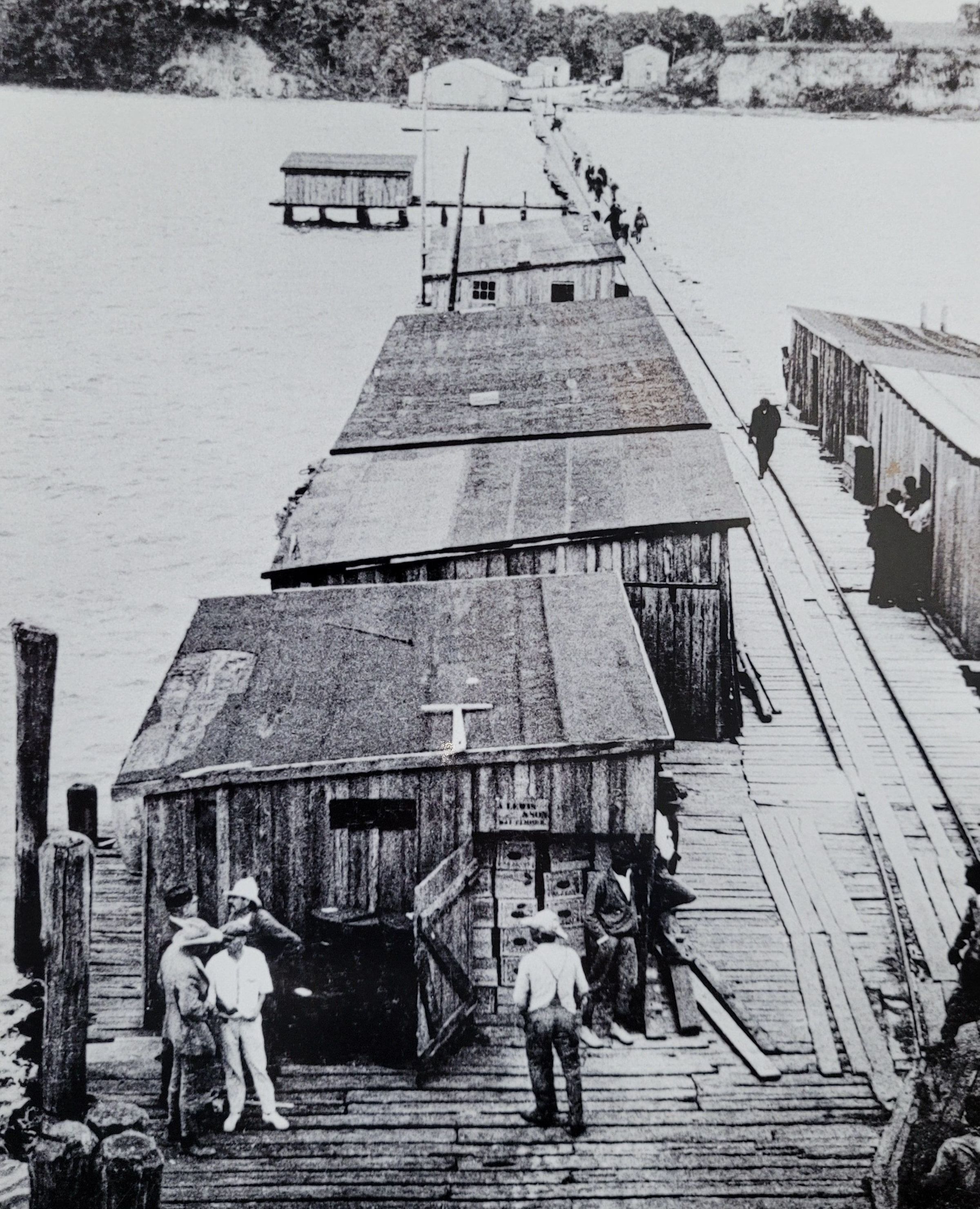 Burhans Wharf on the middle peninsula side of the Rappahannock. White building on the left looking ashore was a pickle factory. The man in the white shirt and tie on the left in the forefront of the picture is Mr. Walden and he is talking to the factory owner. The wharf and other buildings were destroyed in the 1933 hurricane.