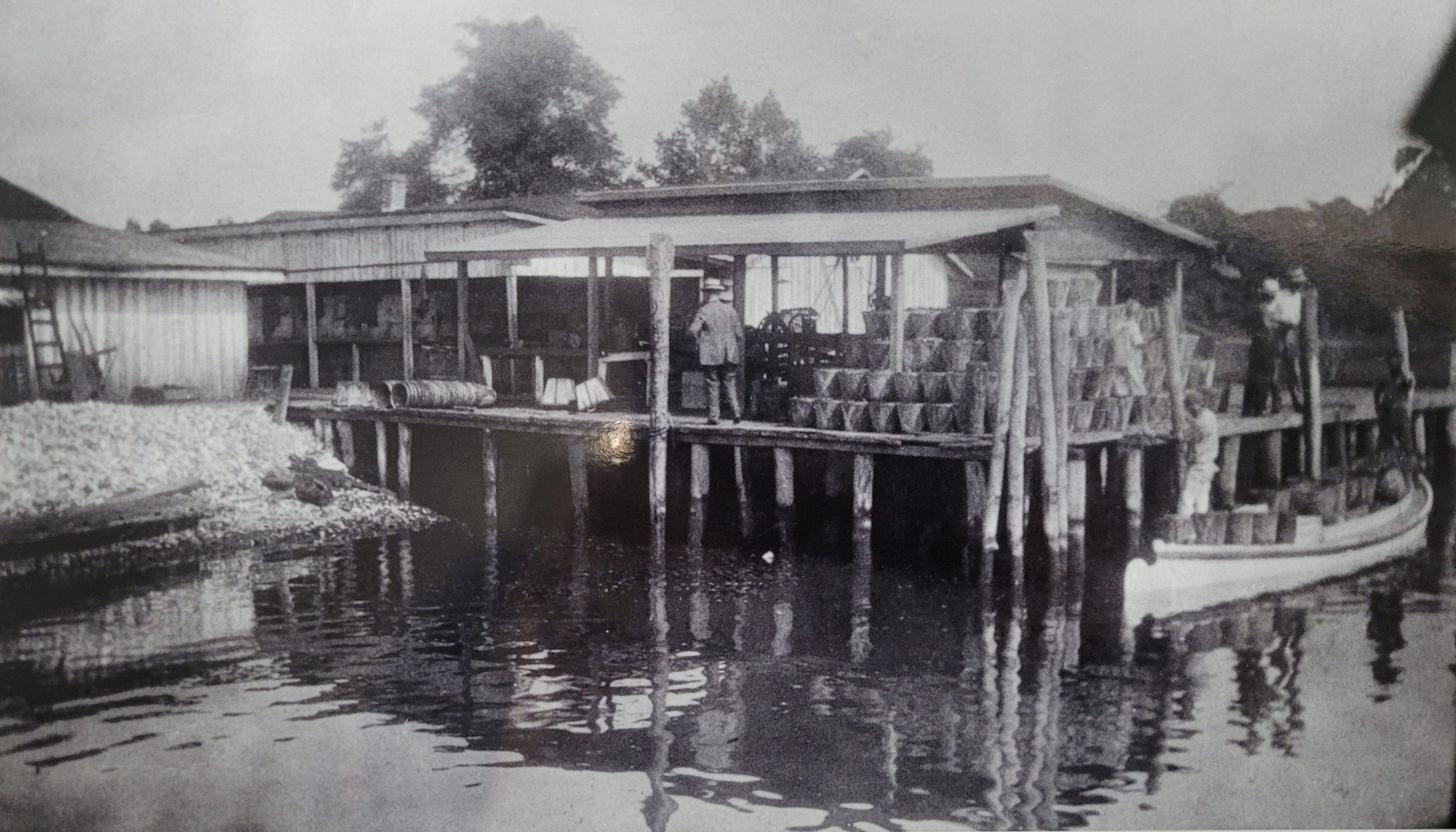 Workers unloading tomatoes from a log canoe owned by Phil Fisher. Taken September 4, 1923.