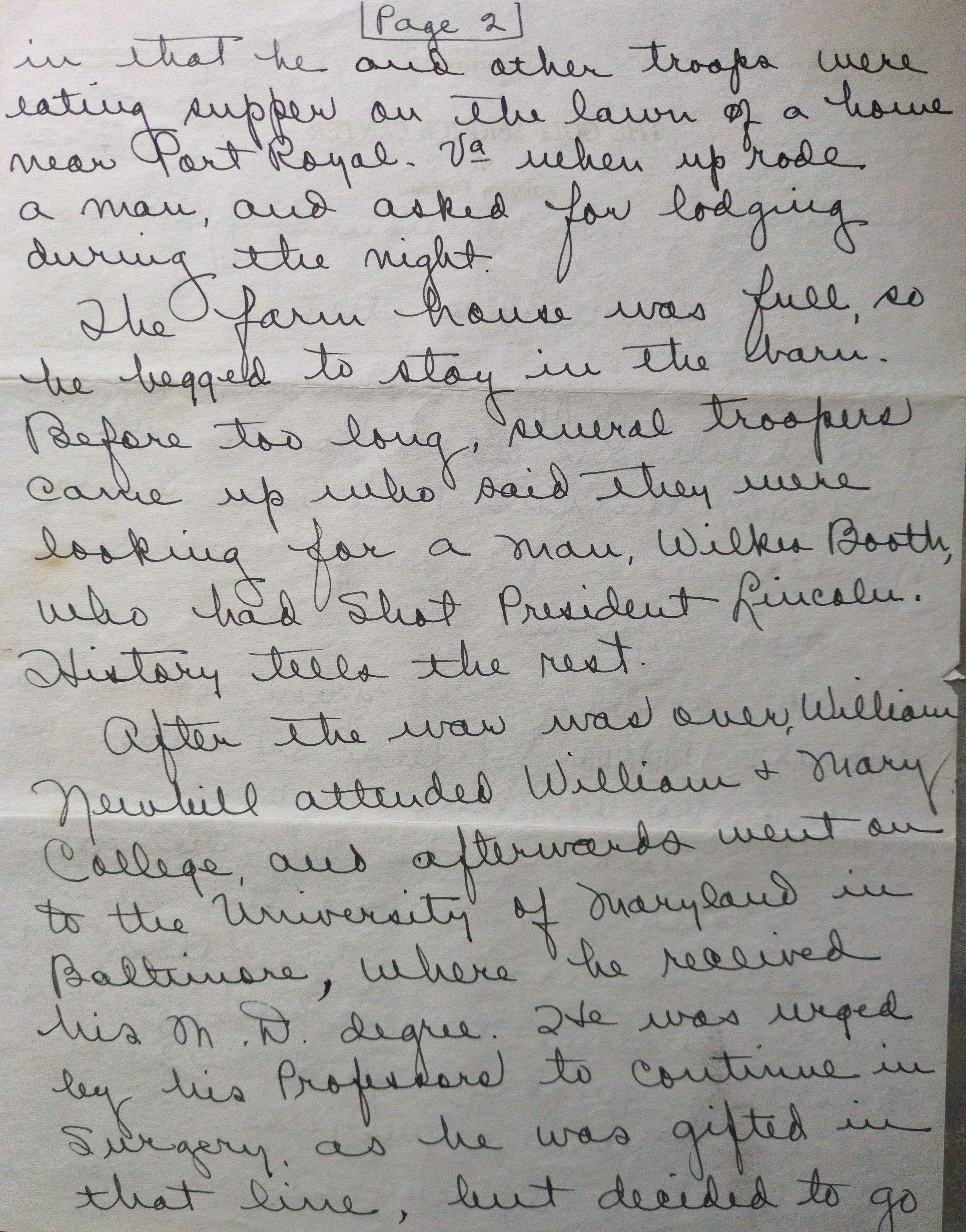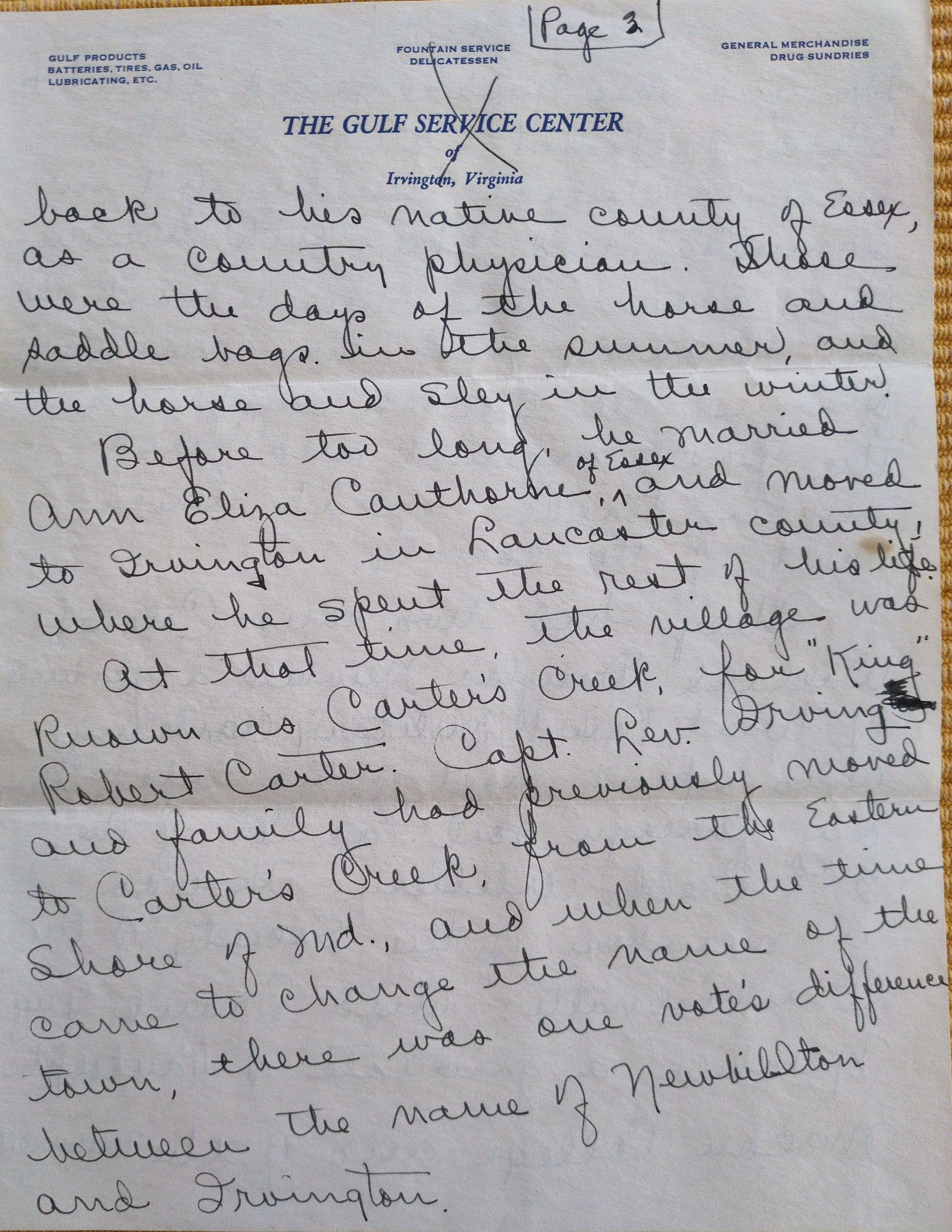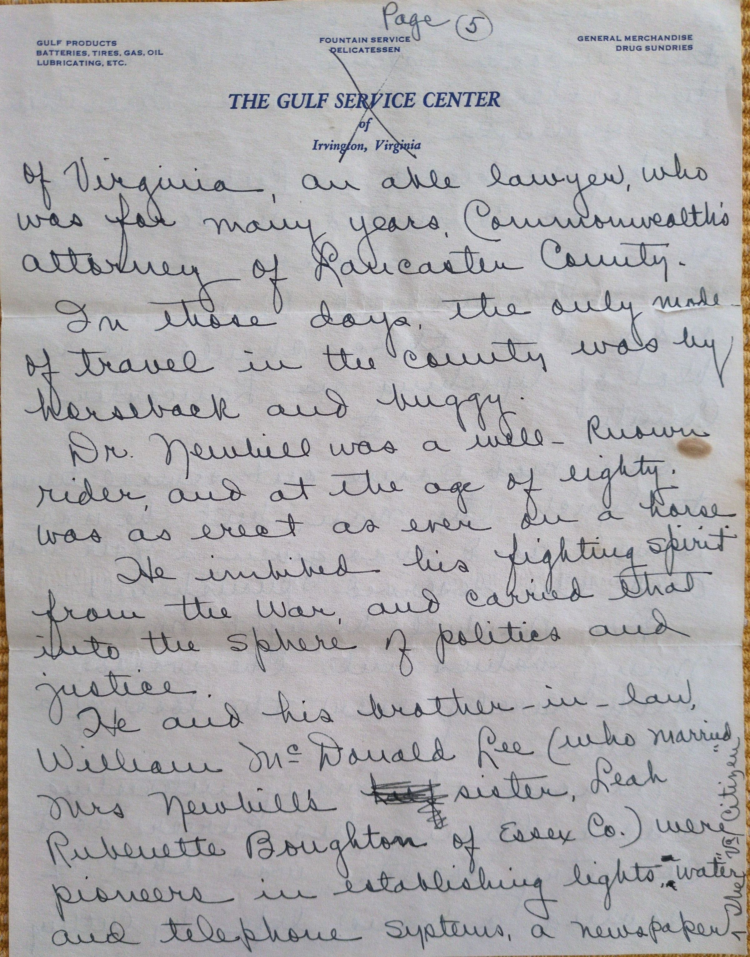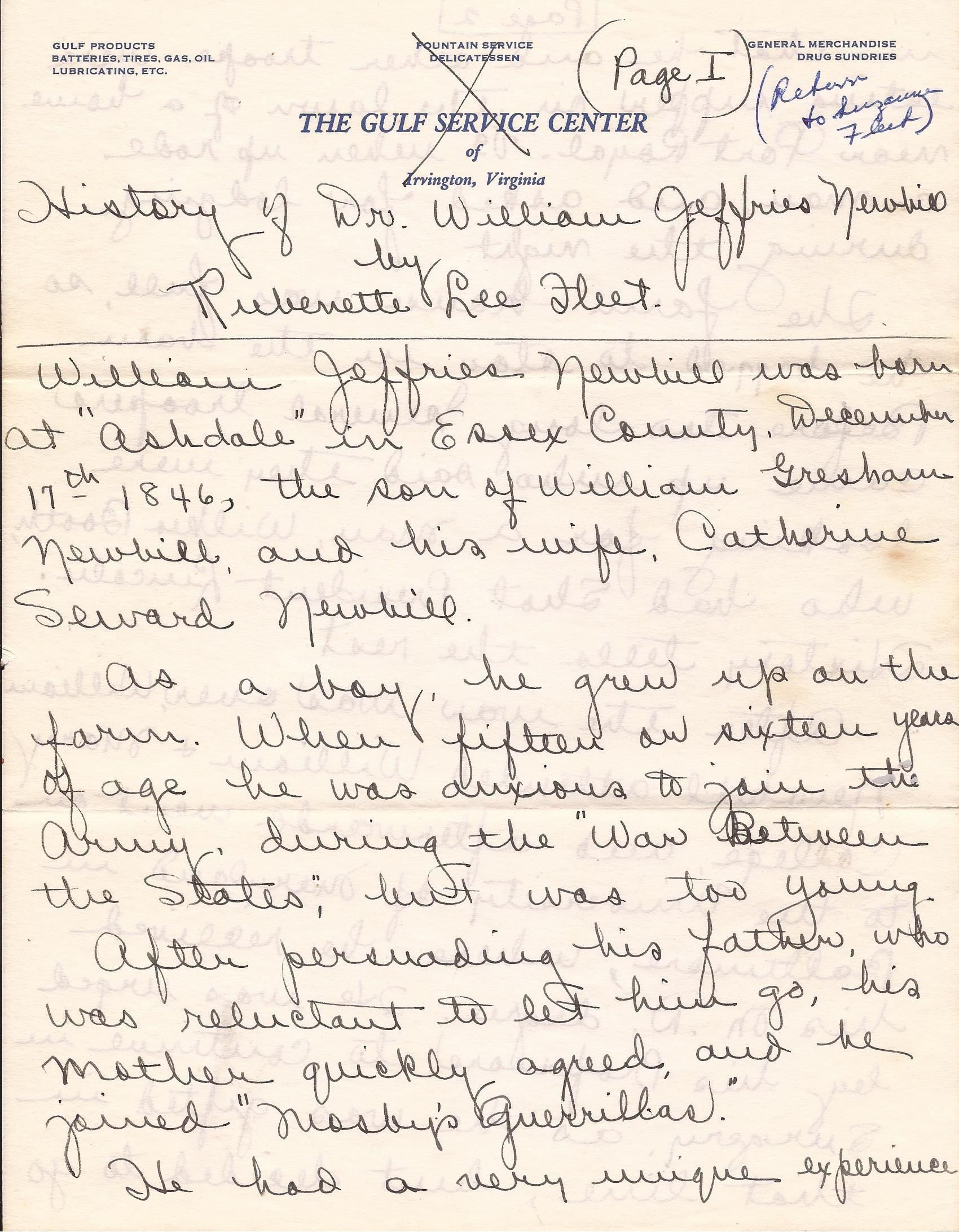 9 page (5 individual pages, front and back) History of Dr. Wm. Jeffres Newbill -- Written on 8½" x 11" "The Gulf Service Center" Stationery by Rubenette Lee Fleet -- A Short History of Dr. Newbill's life from his place of birth in Essex County, Virginia, to his joining Newby's Guerilla's, becoming a physician, and eventually settling in Lancaster County, Virginia.Made/Created