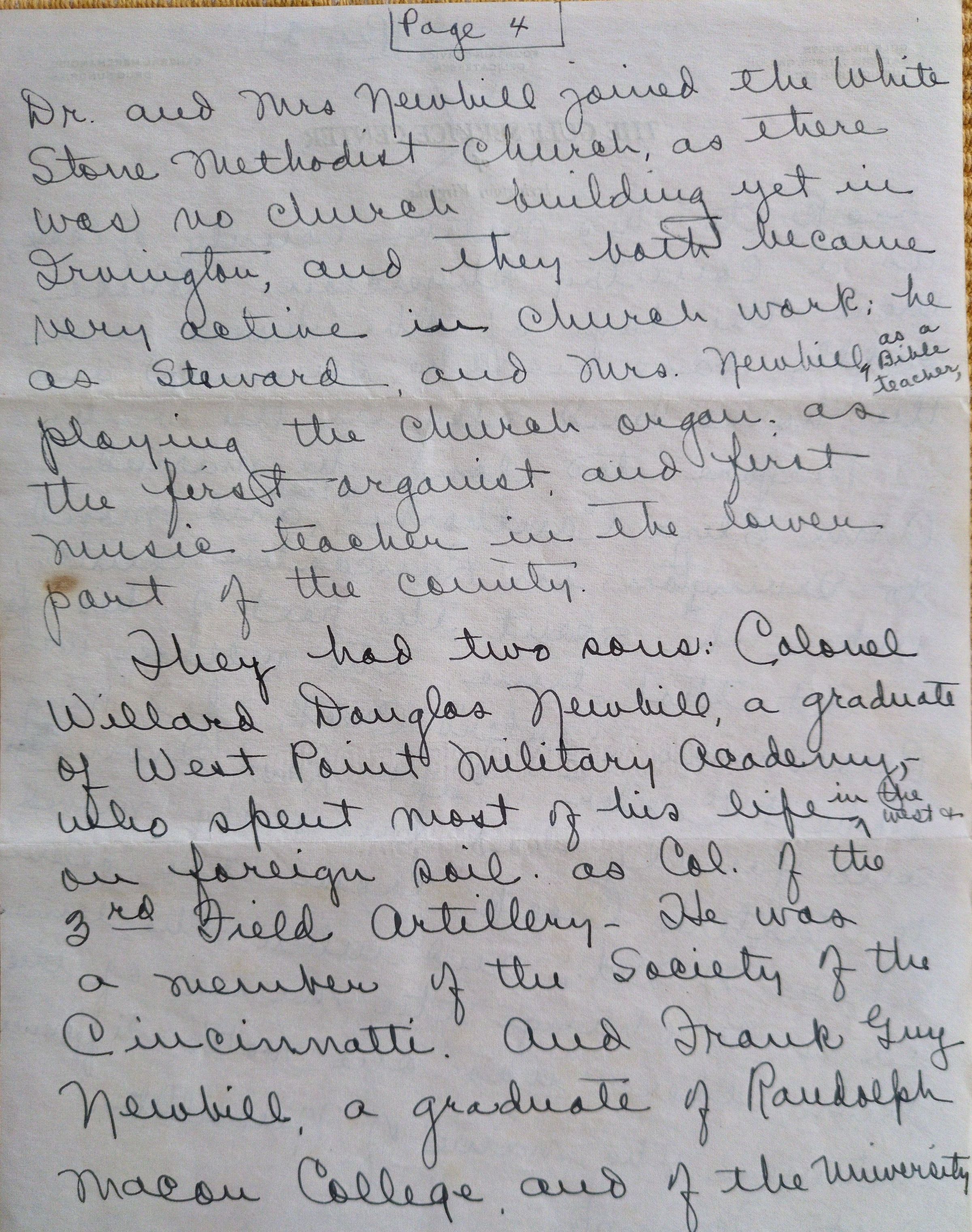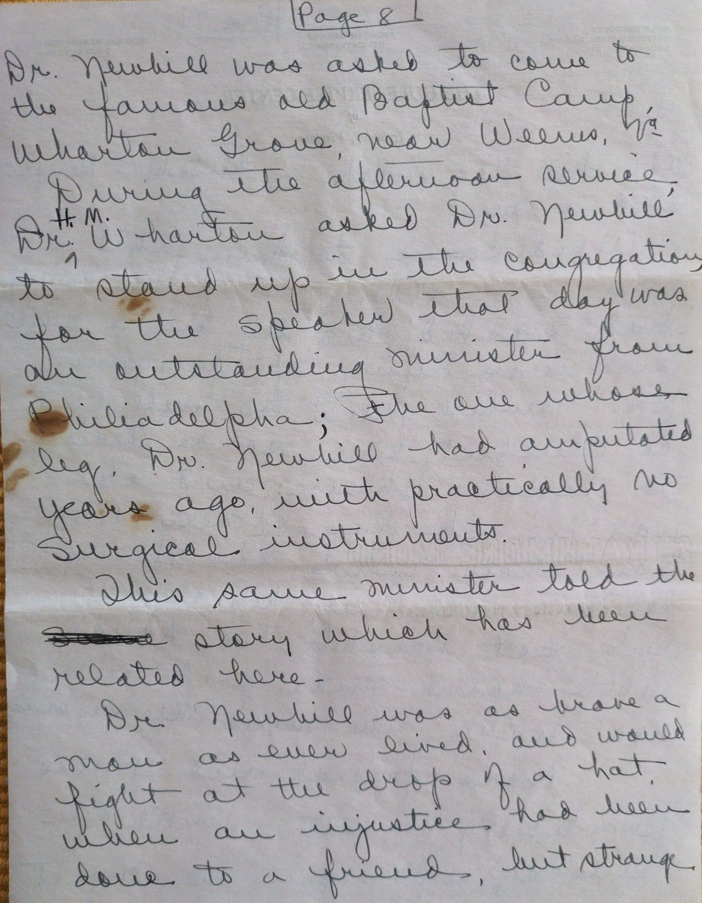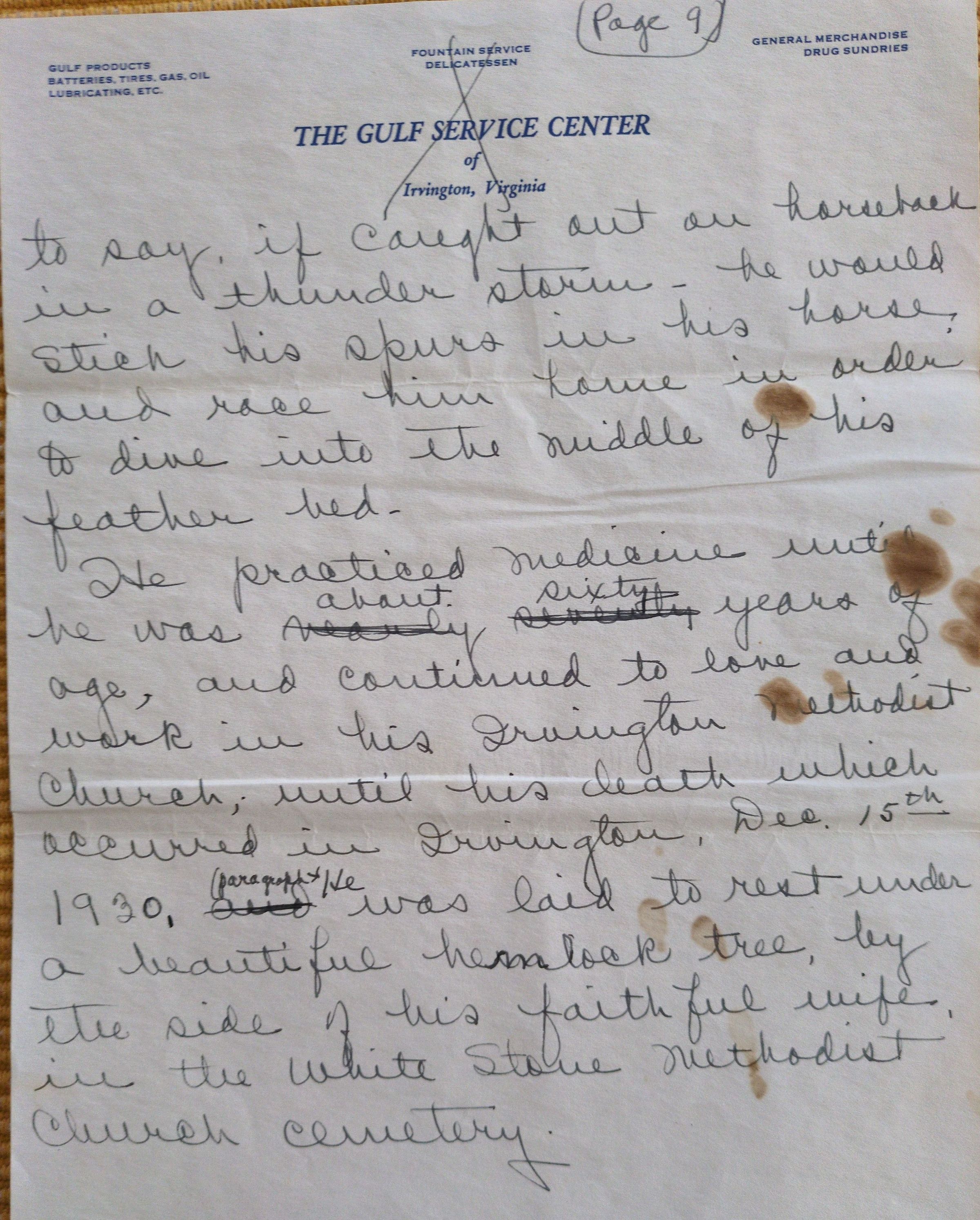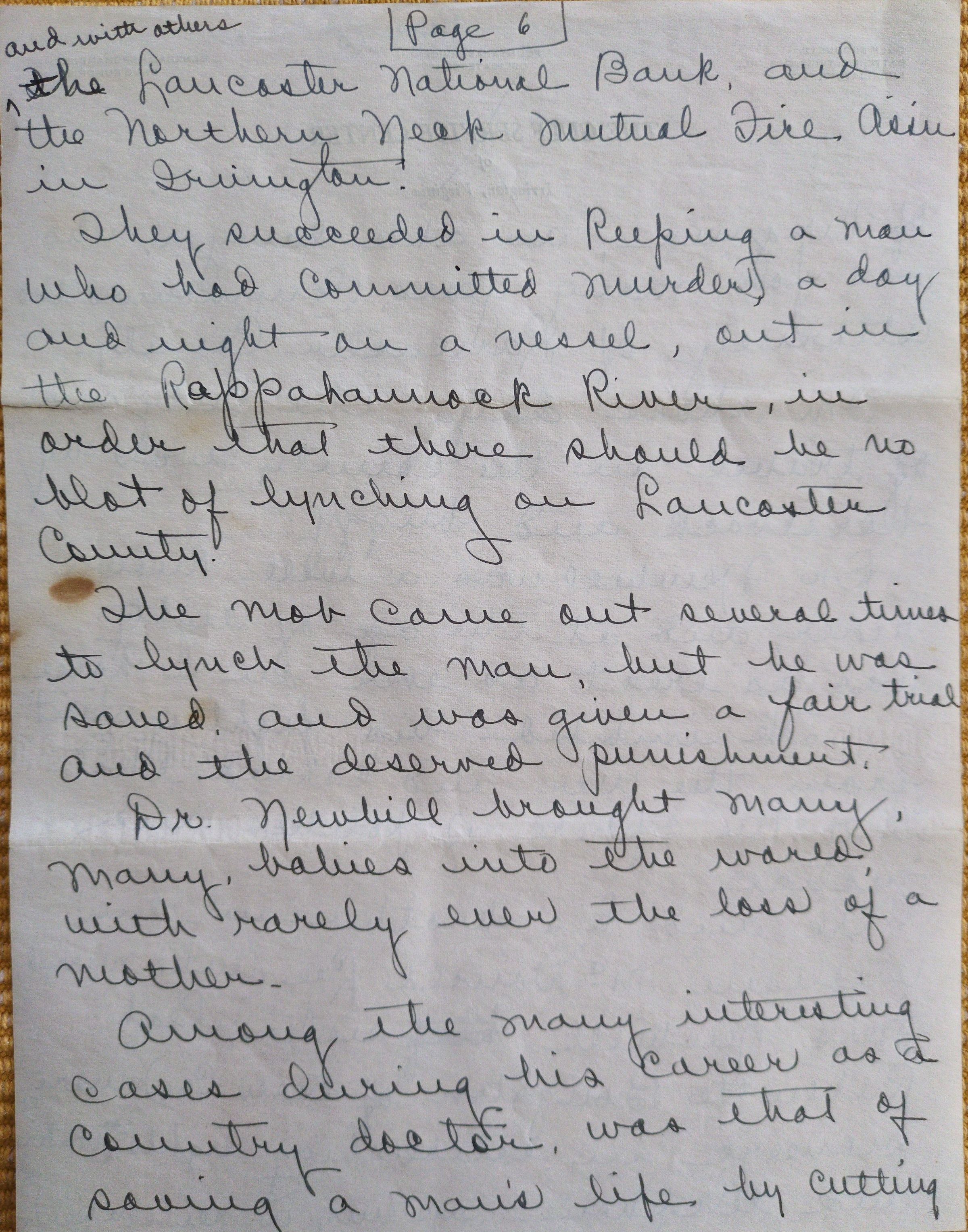 9 page (5 individual pages, front and back) History of Dr. Wm. Jeffres Newbill -- Written on 8½" x 11" "The Gulf Service Center" Stationery by Rubenette Lee Fleet -- A Short History of Dr. Newbill's life from his place of birth in Essex County, Virginia, to his joining Newby's Guerilla's, becoming a physician, and eventually settling in Lancaster County, Virginia.Made/Created
