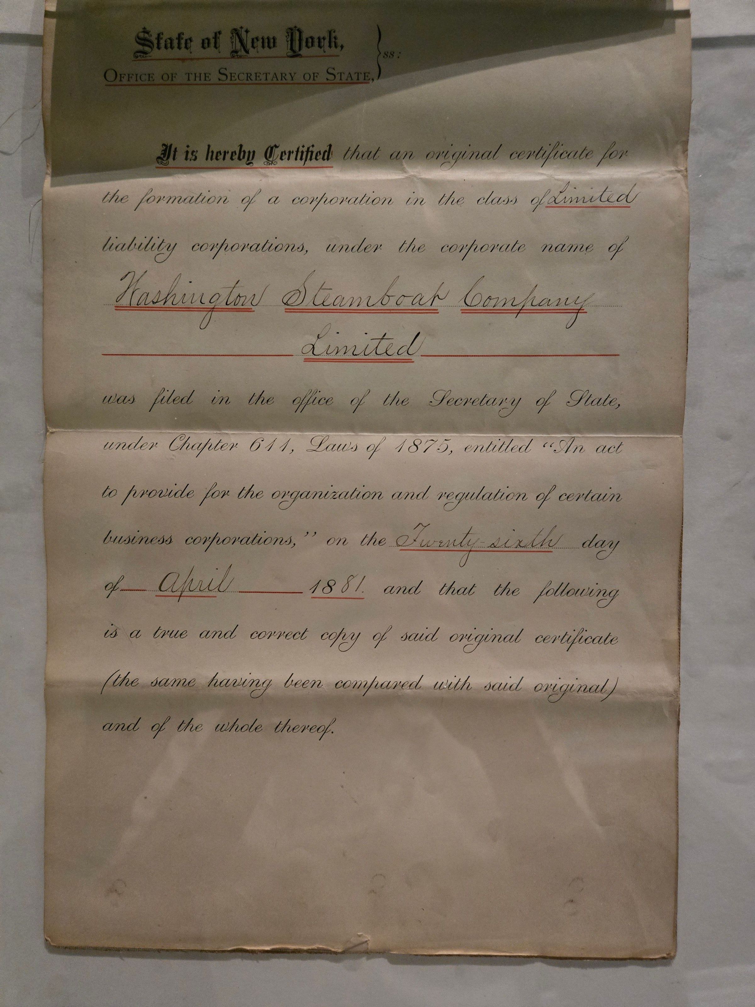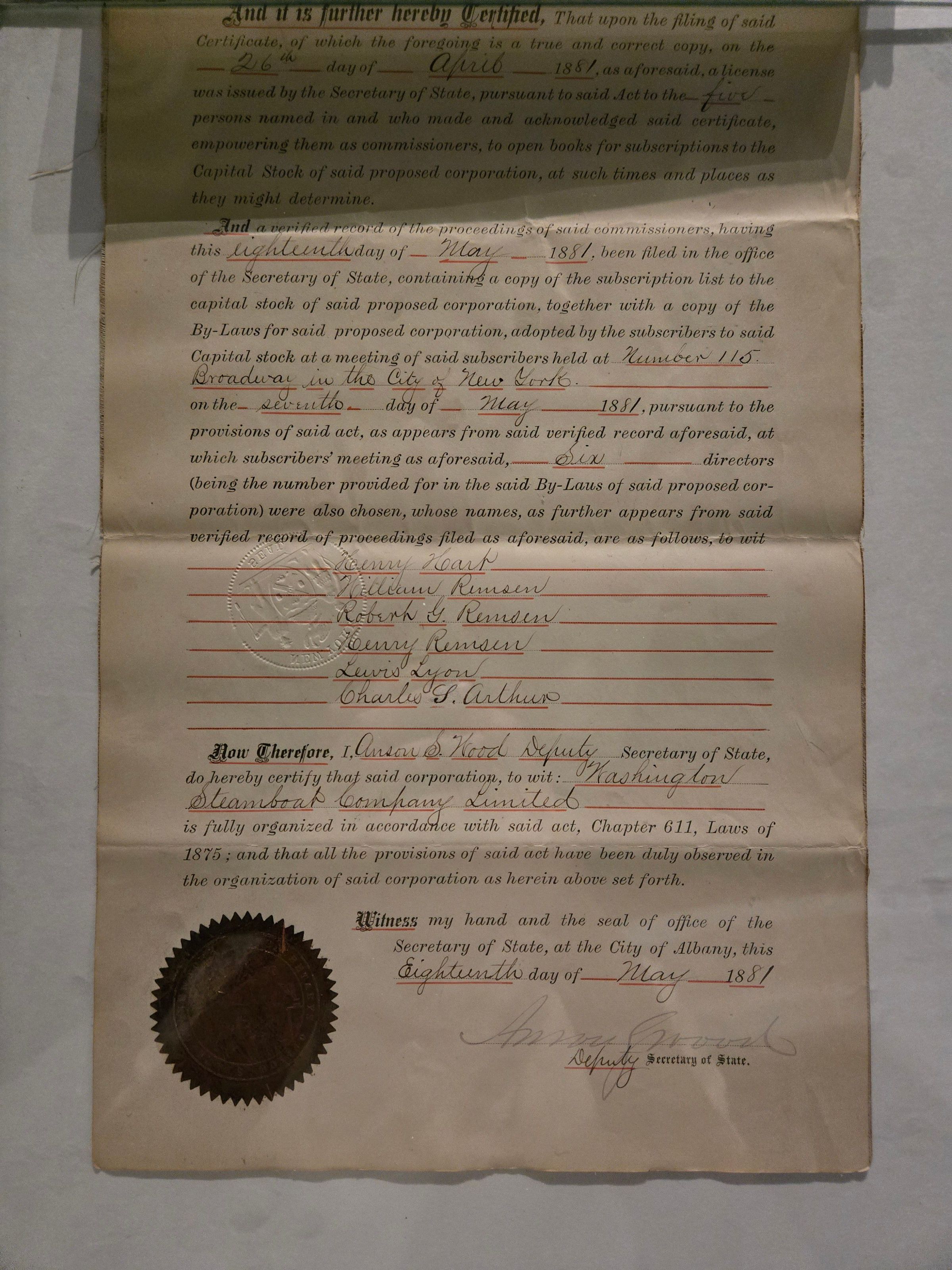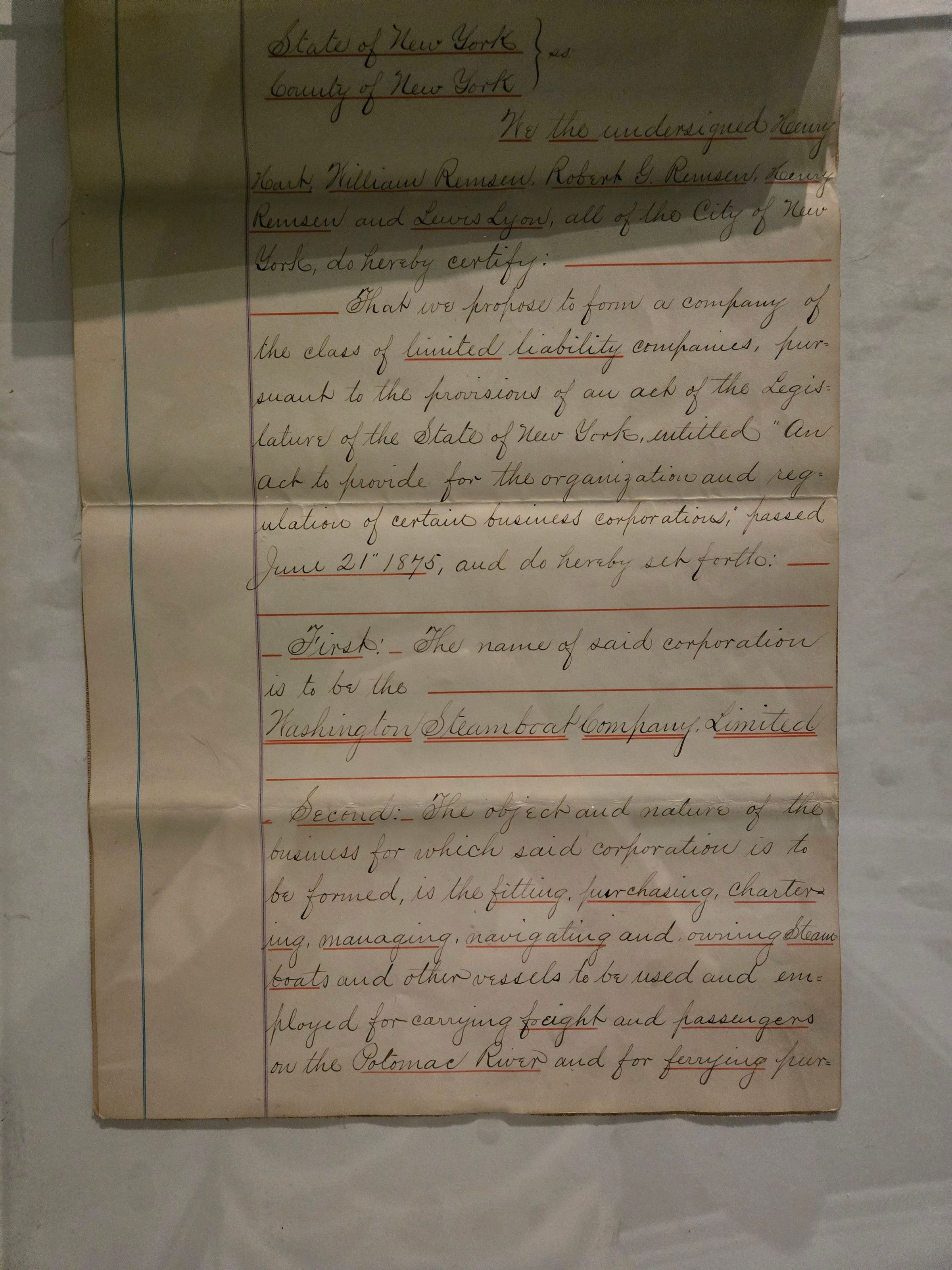 Original Articles of Incorporation for the Washington Steamboat Company (possible another name for the Norfolk and Washington Steamboat Company which was approved by the New York Secretary of State on April 26th, 1881.