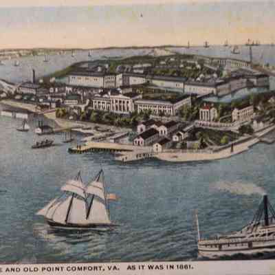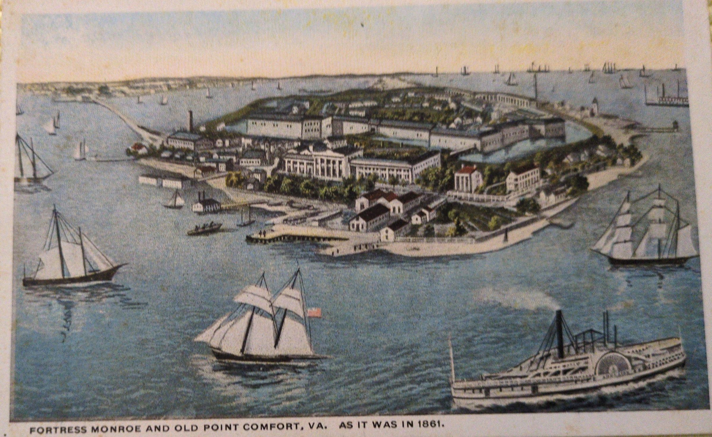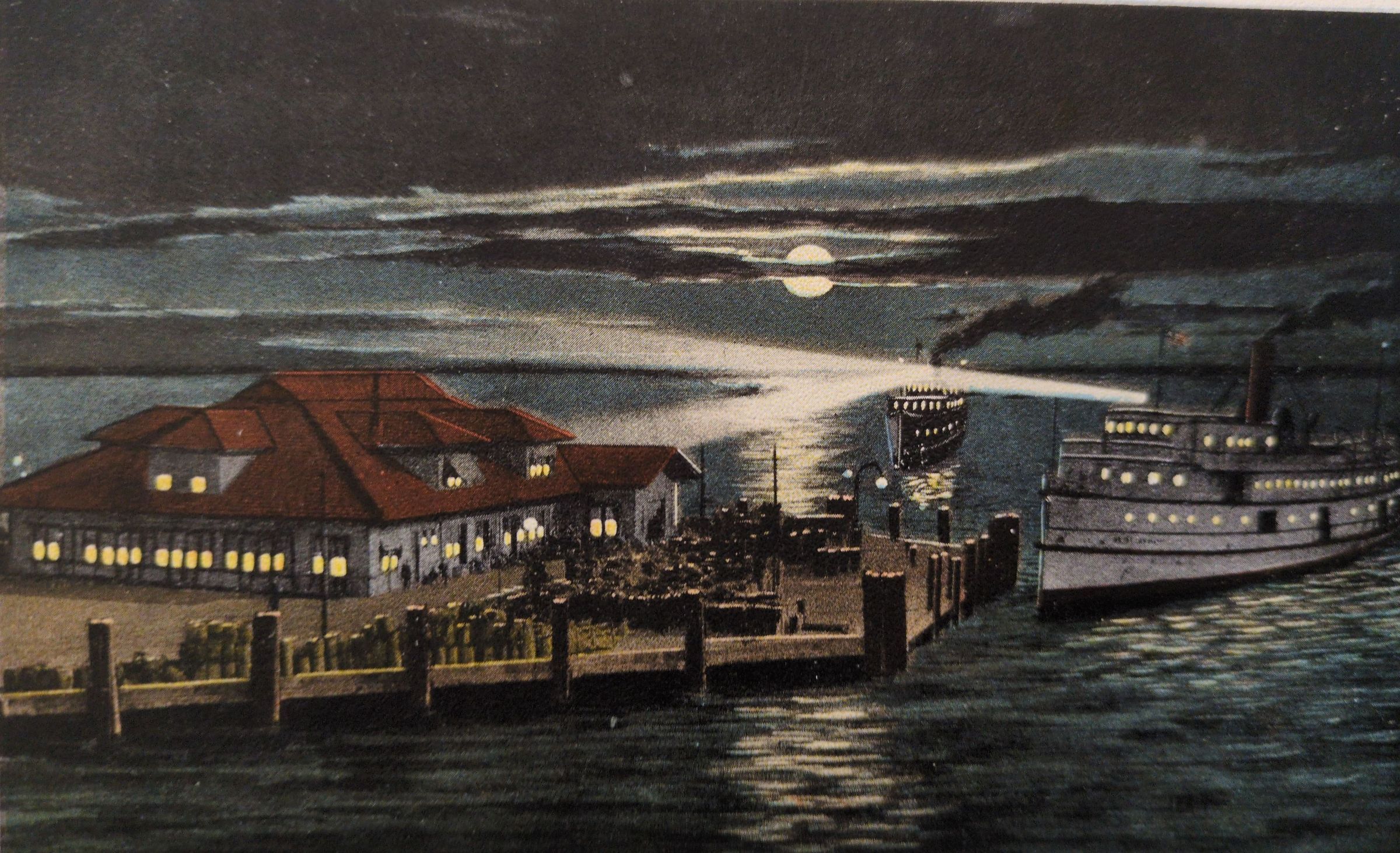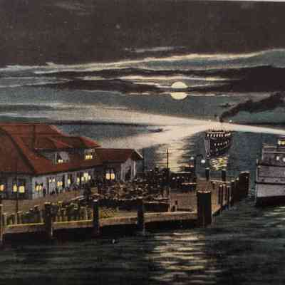 Two postcards with the same image. The one shown here has a note and address on the reverse side and is postmarked Nov 22, 1912. Original accession number is 2017.07.19.12, picture number WH-003. The other is blank on the reverse side. Steamer approaching the pier has Old Dominion Line visible on the port side. Picture number is WH-017B.