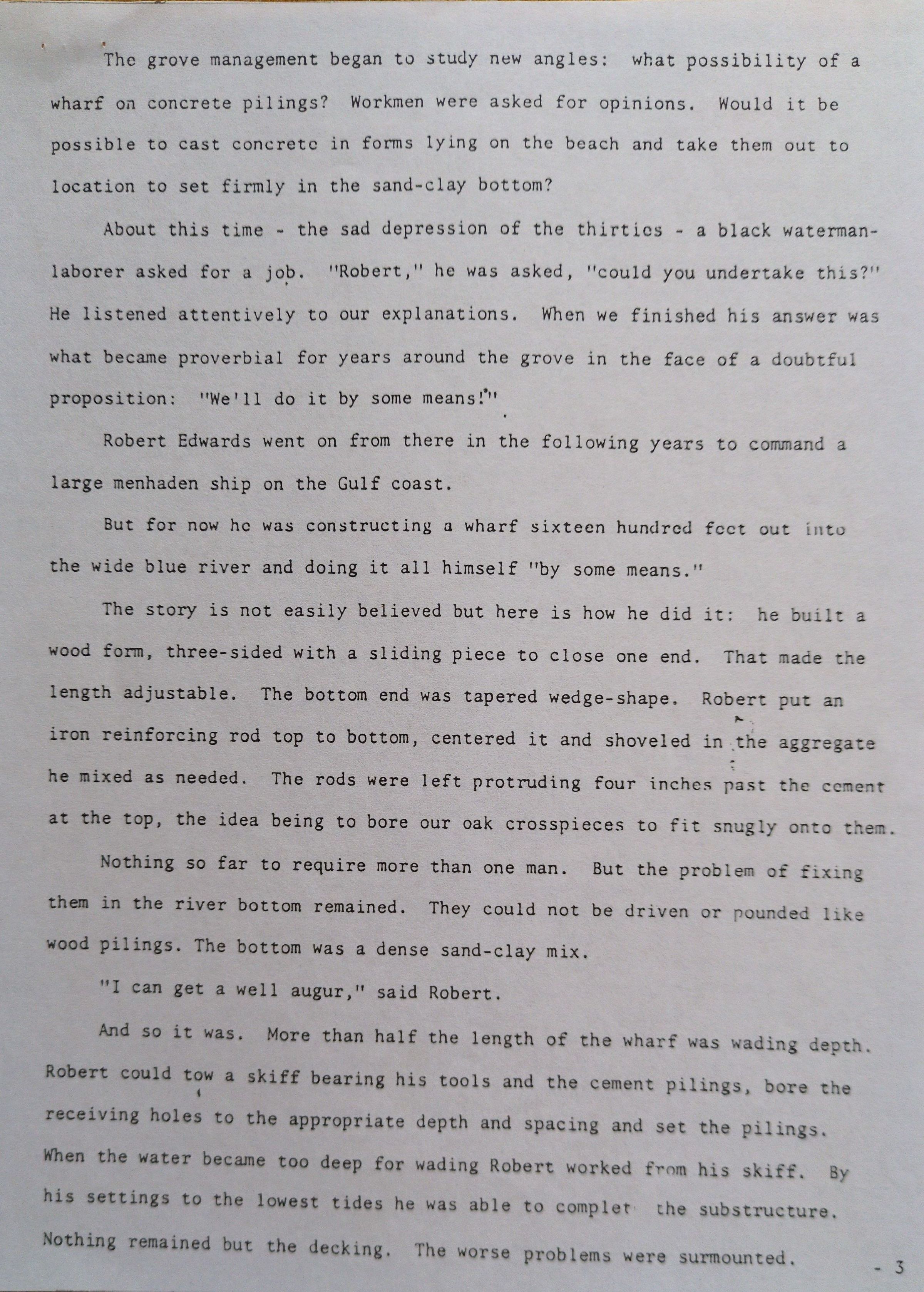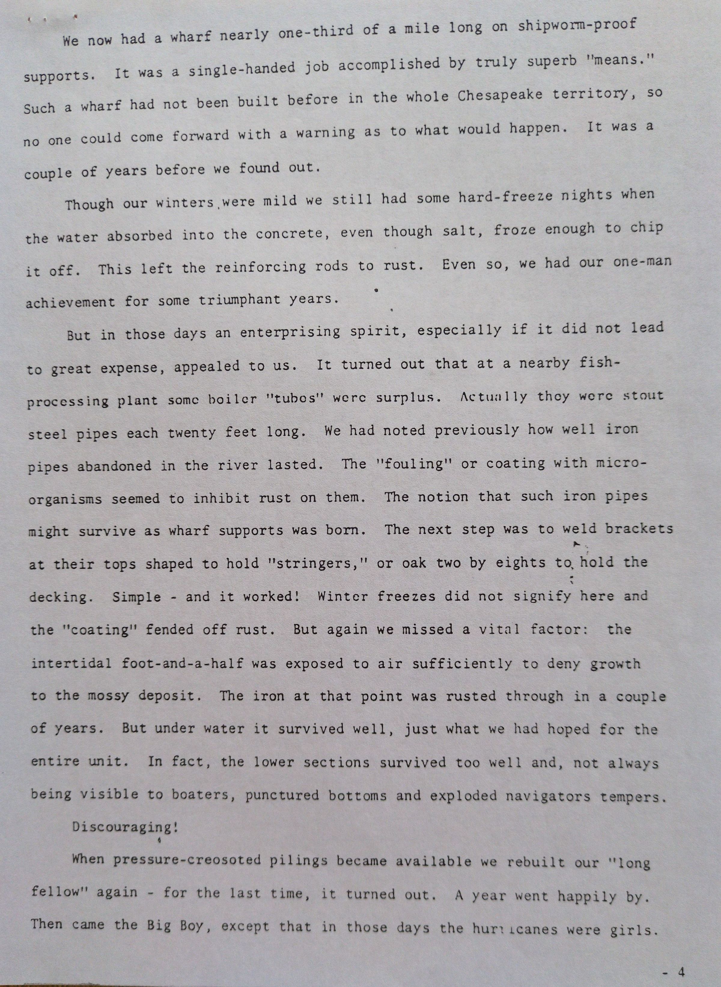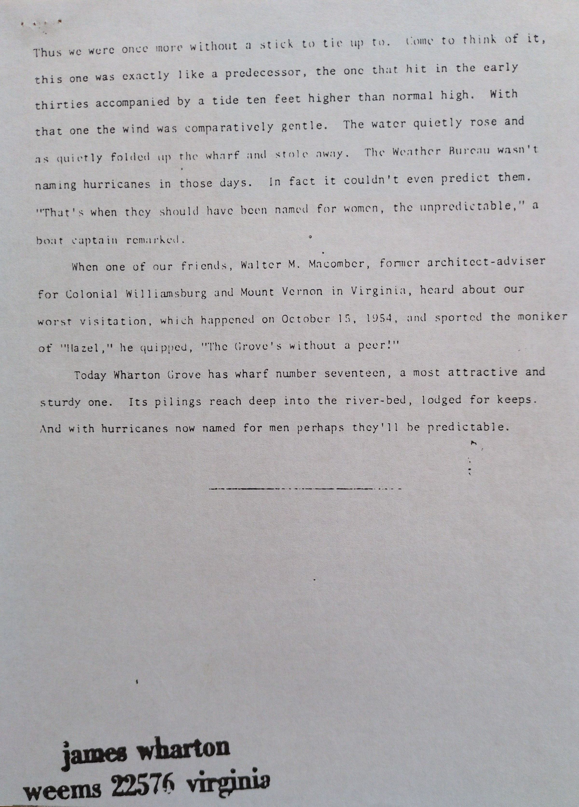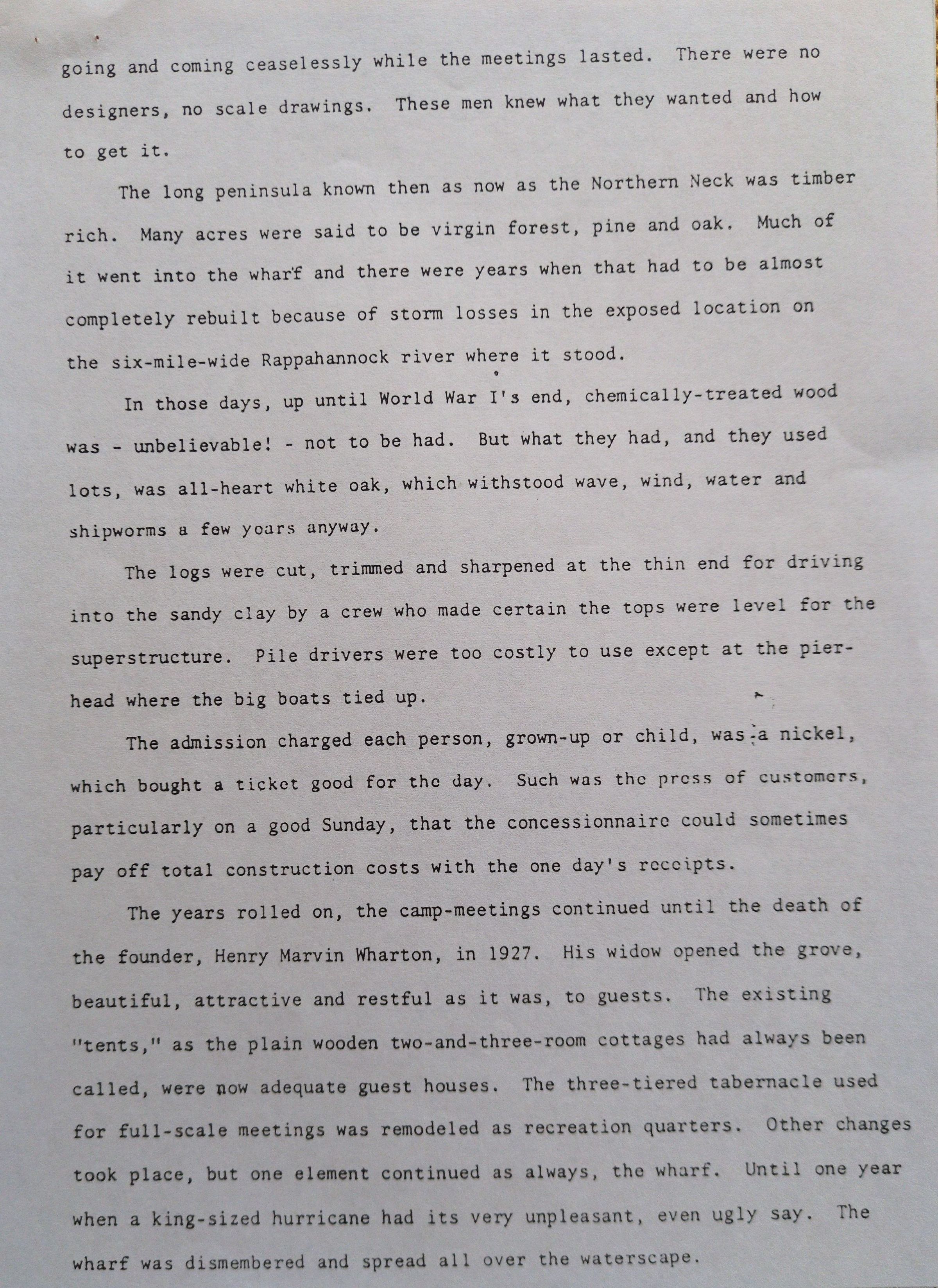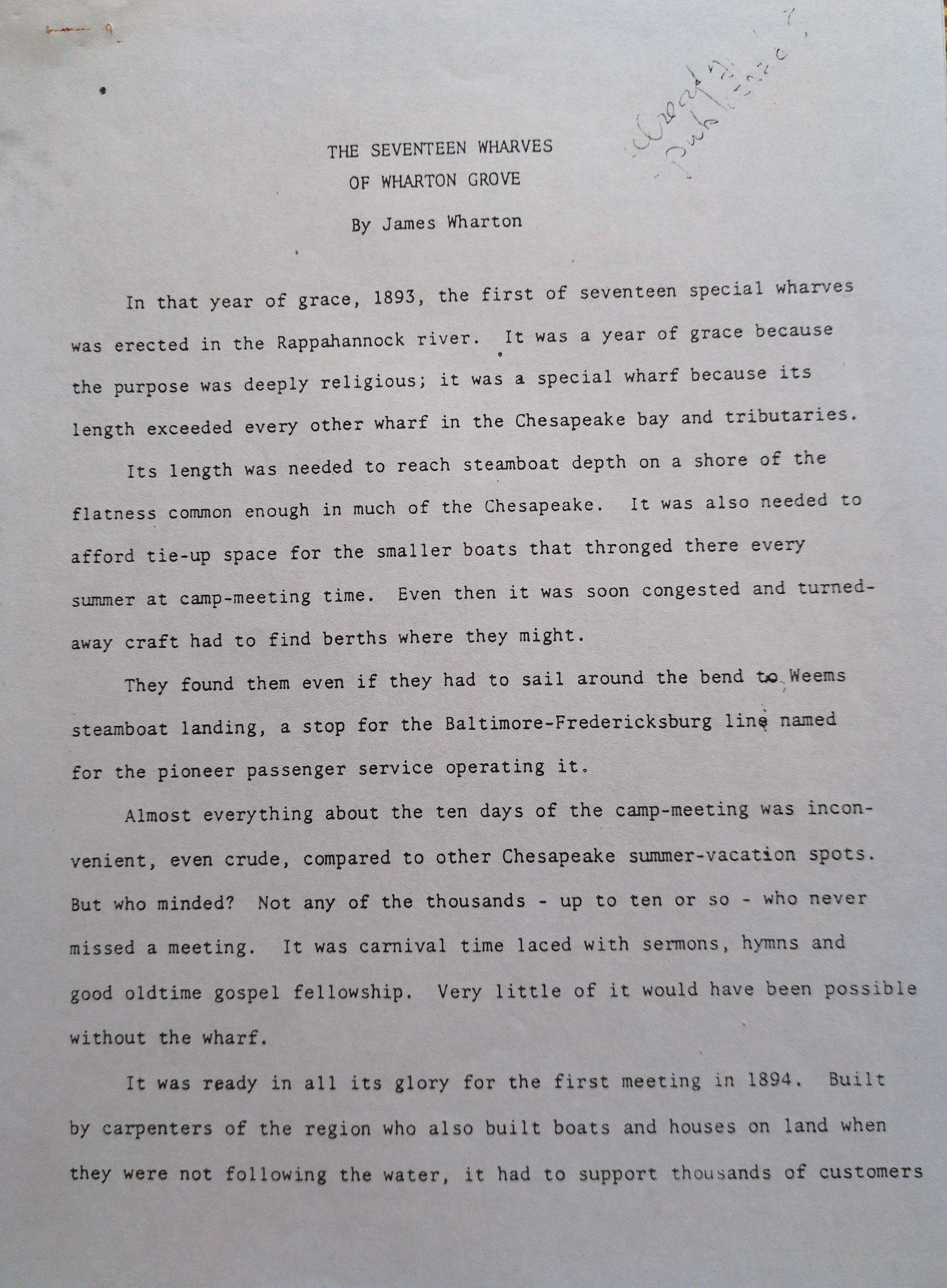 Typed document by James Wharton documenting the various wharves constructed at Wharton Grove in Weems, VA.