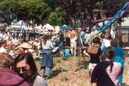 This color photo shows several people standing in an area covered by wood chips. All have their backs to the camera except for one man ion the lower left hand corner who is looking over the shoulder of another man in a maroon sweat shirt, towards the camera. He has black hair and is wearing dark glasses. Beyond the people on the wood chips there are many more people seated or standing on the lawn roughly in a circle around the center area.Collection