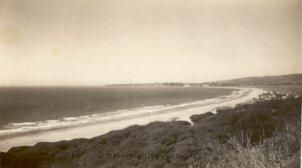 Panorama of Stinson Beach taken from the hill above. Shows houses in Calles and Patios. Green (Willows) in foreground where existing GGNRA parking and picnic is located now, a couple of building could be seen abour where the post office complex is located. Bolinas Lagoon and Bolinas could be seen in distance.Collection