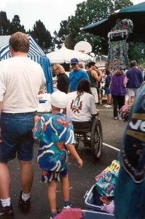 This color photo shows a man in a white t shirt and blue shorts with his back to the camera on the left side of the picture. A child in a blue, white and red print shirt with matching shorts and a white hat is wlaking beside him, holding on to the man's back pocket. Beyond them at the center of the photo is a man in a wheelchair (Michael Mitchell) also moving away from the camera. There are various people in the background as well as a blue and white striped cabana and a white umbrella. The ground is the basketball court with white lines painted on it. Trees are visible behind the people and umbrellas.Collection