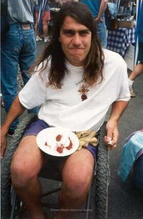 This color photo is of a man in a wheelchair (Mike Mitchell). He is smiling at the camera. His dark hair is long, several inches below his shoulders. He is wearing a white t shirt and purple shorts. He has a plate of strawberry shortcake in his lap and is holding a white plastic fork in his left hand.Collection