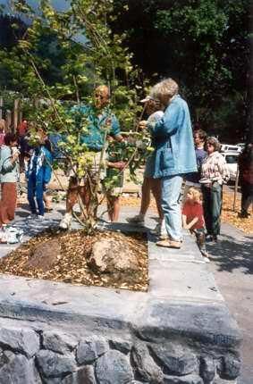This color photo is of several people standing on and around a raised stone bed in which a tree is planted. The man in a green shirt standing behind the tree is Web Otis. There are two women standing on the stone wall to the right of the picture. The one closest to the camera is wearing a blue jacket and blue jeans. Behind these figures and to the right, standing on the path below are a child in a red shirt, a woman in a light patterned shirt (Carol Wagner) and a person in a blue shirt (mostly obscured). There are two people in the background on the path at the left of the picture.Collection