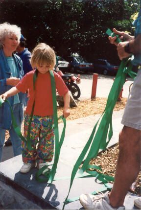 The same child as in the previous photo stands with the green ribbon draped over his shoulders looking down at the ground. The partially visible male is holding one end of the ribbon, a white haired woman in blue is standing behind the child looking on.Collection