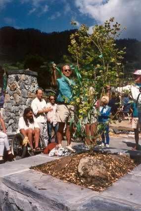 Tree planting/ribbon cutting ceremony at the entrance to Village Green I. Web Otis is holding the green ribbon that encircles the small tree (supported with one hand by Ginny Otis) in a cement planter. Standing in front of the stone entrance looking on is Bill Scott (center) in a white chef's jacket clapping, Michael Knowlton (right) in sunglasses with his hands in his jeans pocket, and Michael Mitchell in a wheelchair. The hillside is dark behind them but the sky is deep blue with wispy clouds.Collection